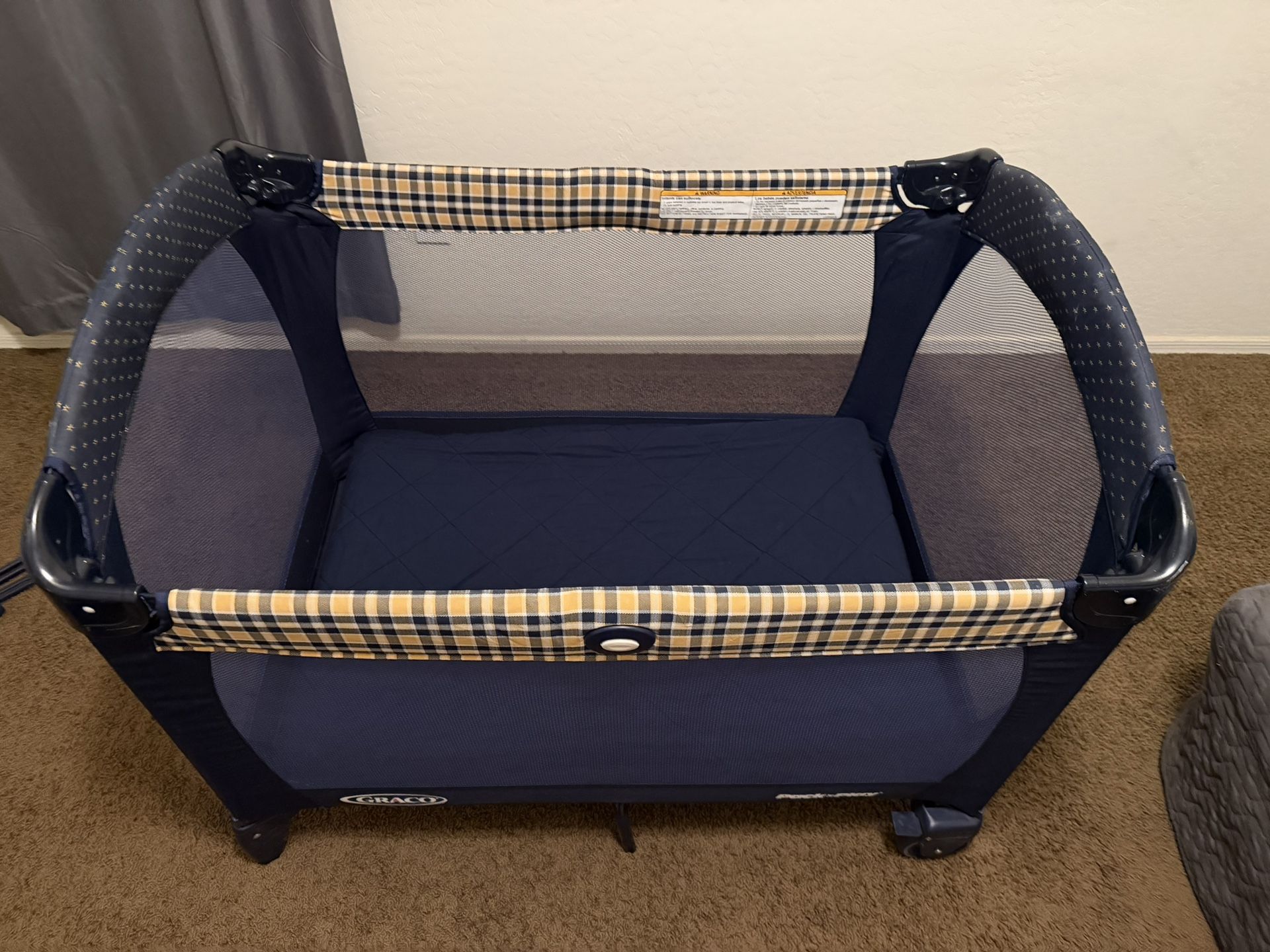 The Graco Pack 'n Play Playard Simple Solutions is portable play yard full of features moms love. It has an integrated diaper changing station, plus a storage pouch for essentials, so it's convenient to keep baby clean, fresh and content. The removable full-size bassinet gives your infant a comfortable and familiar sleep spot, then as baby grows, it transitions to a spacious toddler playpen, for a safe place for rest and play. Wheels and feet fold in, for 20% more compact storage size compared to other Graco play yards. Includes carrying bag for no-fuss storage or travel, plus Graco's signature fast and easy push-button fold.
