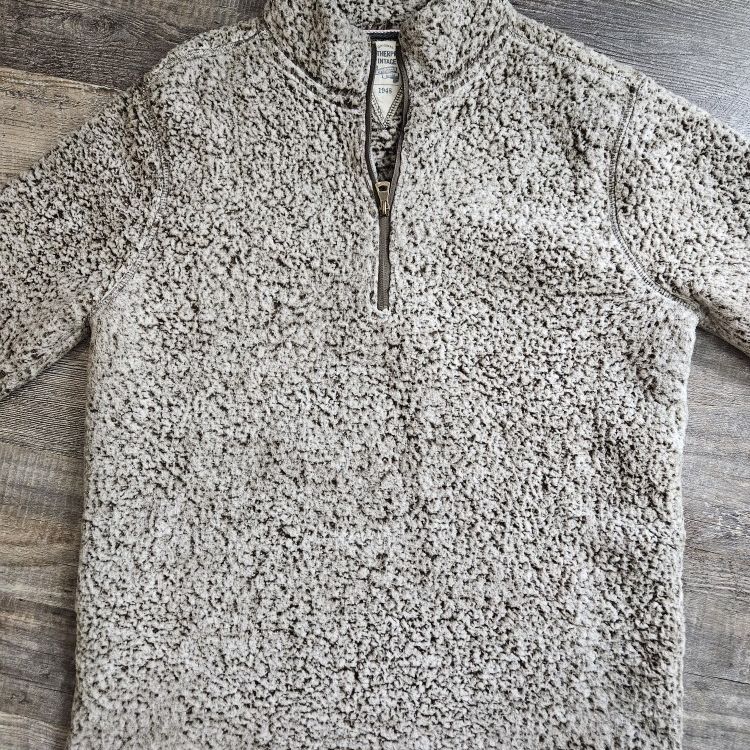 Cozy Weatherproof Vintage teddy sherpa fleece pullover with quarter zip neckline. Soft textured pile, warm neutral oatmeal/grey color. Perfect casual fall/winter layer. Brand: Weatherproof Vintage Style: Sherpa / Teddy Fleece 1/4 Zip Size: Large (L/G) Color: Oatmeal / Grey Condition: Excellent pre-owned condition