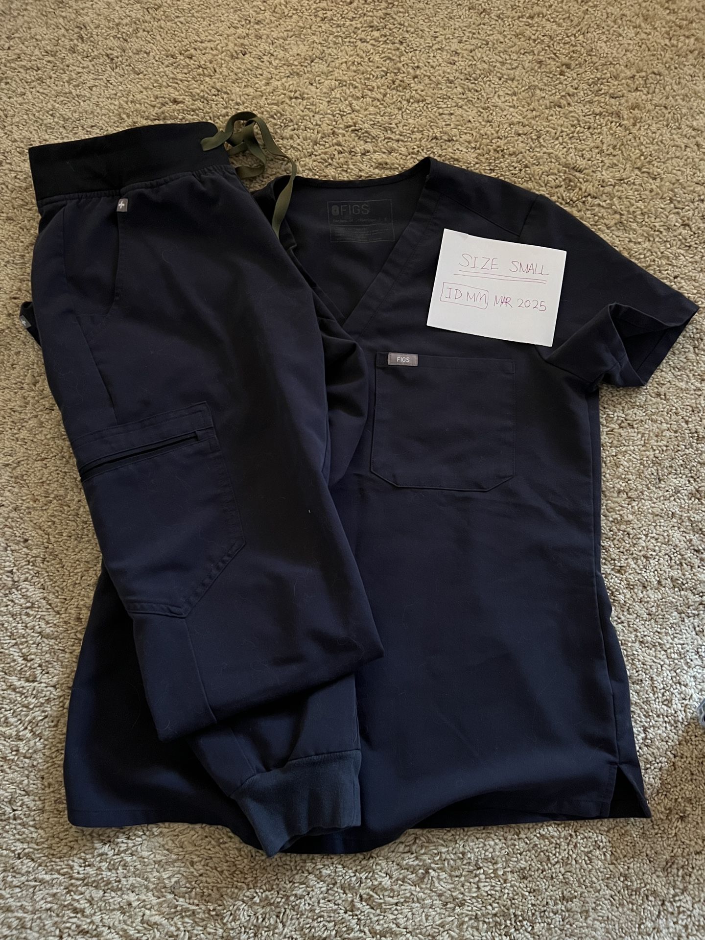 Top- Catarina One-Pocket Scrub Top (size small) Bottom- Zamora Jogger Scrub Pants (size small P) fit height under 5’5 Color: Navy Both pieces are in excellent condition. Selling because my work only allows deep purple now.