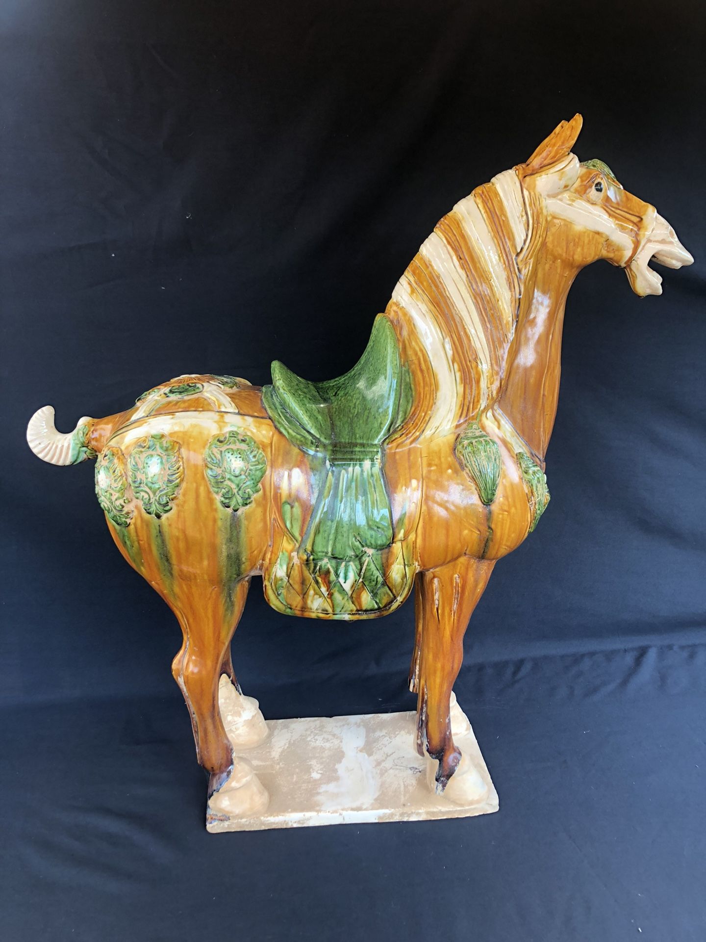 Tang dynasty ceramic horse is molded and sculpted earthenware with tri-color glaze in green, yellow and white. Tested in Luminescence Dating Laborratory at University of Washington; please see attached copies. Will provide the lab copy to purchaser. Height 69.80 cm. The Sancai porcelain style was predominant during the Tang dynasty (618 - 911). Its main origins are in northern China. Sancai Ceramics are created in a wide range of decorative forms often with bright colors. Because of the style's liberal use of green, yellow and white, Sancai is sometimes called egg-and-spinach in the west. The Sancai technique used a low-temperature glazing and white clay, and later finishing pieces by firing at a higher temperature of around 800C. Figures such as horses were formed by molding and adding white clay. Glazes on Sancai pieces often flowed downward during firing and colors commonly appear uneven.