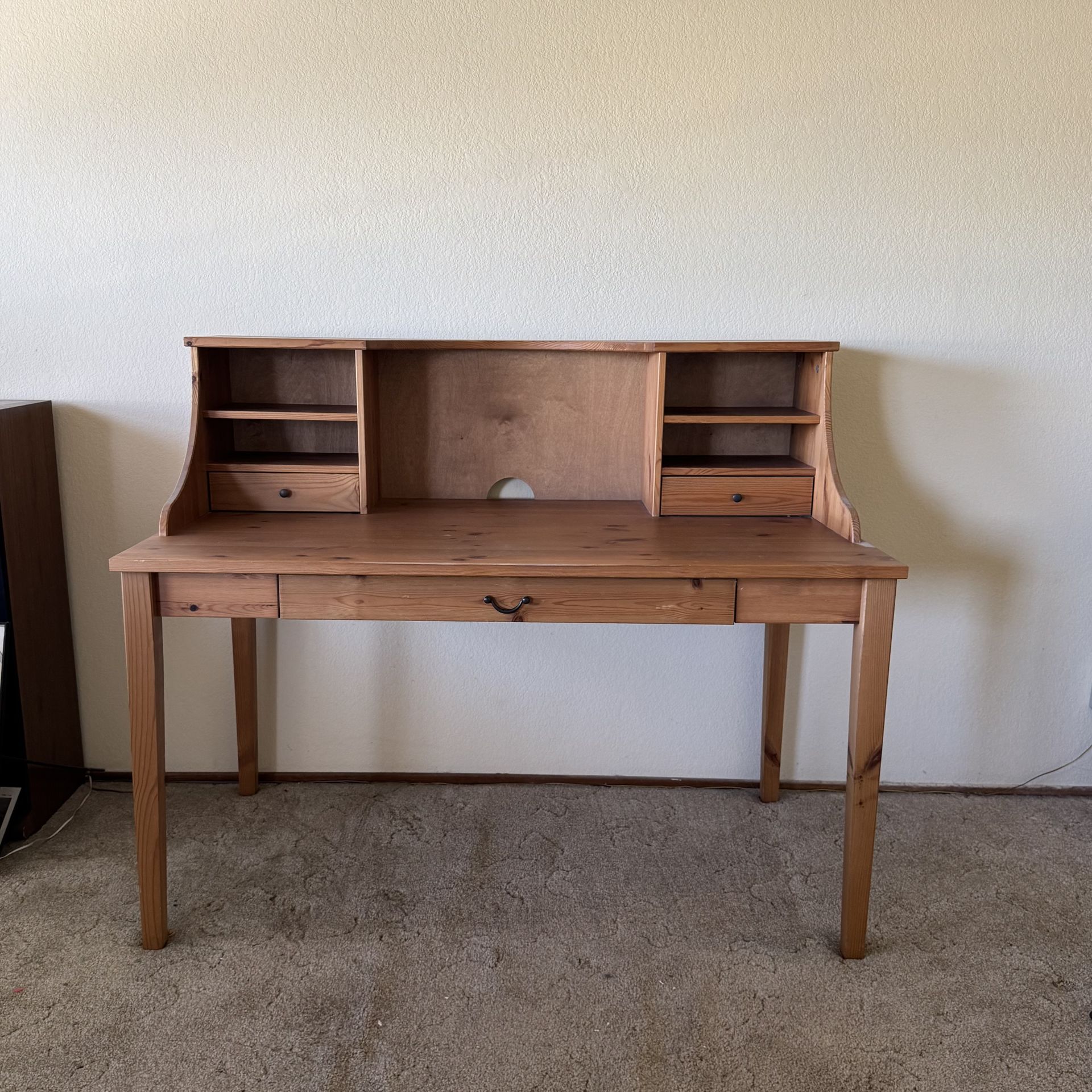 Wood desk, ideal for a student. small desk drawers only, but pairs well with small file cabinet underneath. Approx measurements 51” wide 28” deep 43” tall