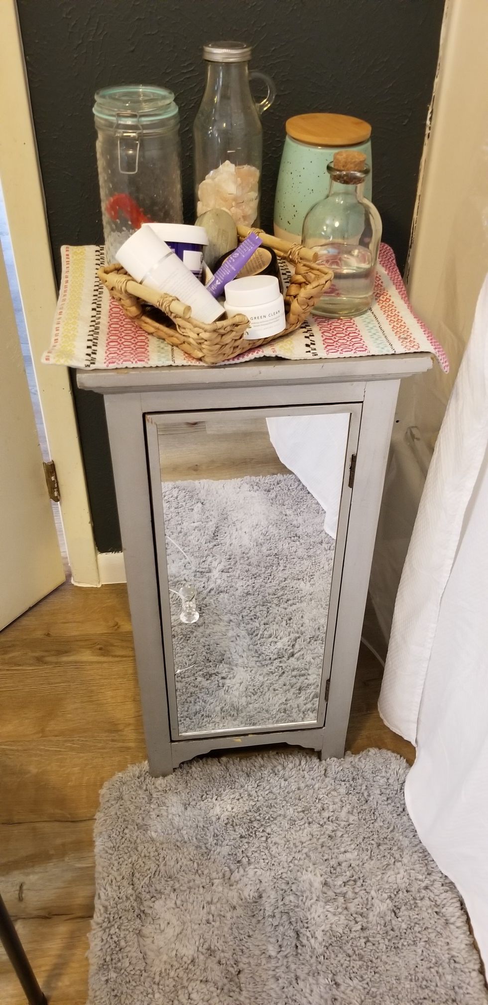 Shiny grey, mirrored cabinet. Good condition other than the cracked mirror around handle.13"x13"x32"