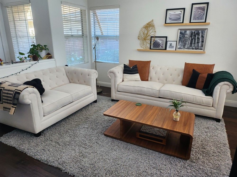 Tufted White/Ivory Couch And Loveseat in good condition. Does have some stains. No delivery, must pick up. Couch Top: 92in x 40in x 30 in Base: 85in x 40 in Loveseat Top: 66in x 40in x 30in Base: 60in x 40in