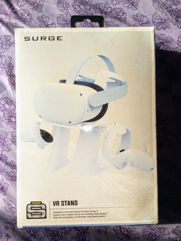 Elevate your Meta Quest 2 setup with this convenient VR Stand. It securely stores your headset and controllers in a space-saving vertical design. Anti-slip pads on the base offer improved stability, and the large, lens-friendly headset tray holds your Quest 2. Designed for the Meta Quest 2 (not included) but built for you, the stand offers wide compatibility and is capable of holding various headsets. From Surge. Stores Meta Quest 2 headset and controllers in a space-saving vertical design Anti-slip pads on base For use with Meta Quest 2, Meta Quest 1, and various other headsets, not included Measures approximately 2.63" x 7.2" x 10.2" Brand new... Box a bit damaged but otherwise brand New(check photos)... OBO...