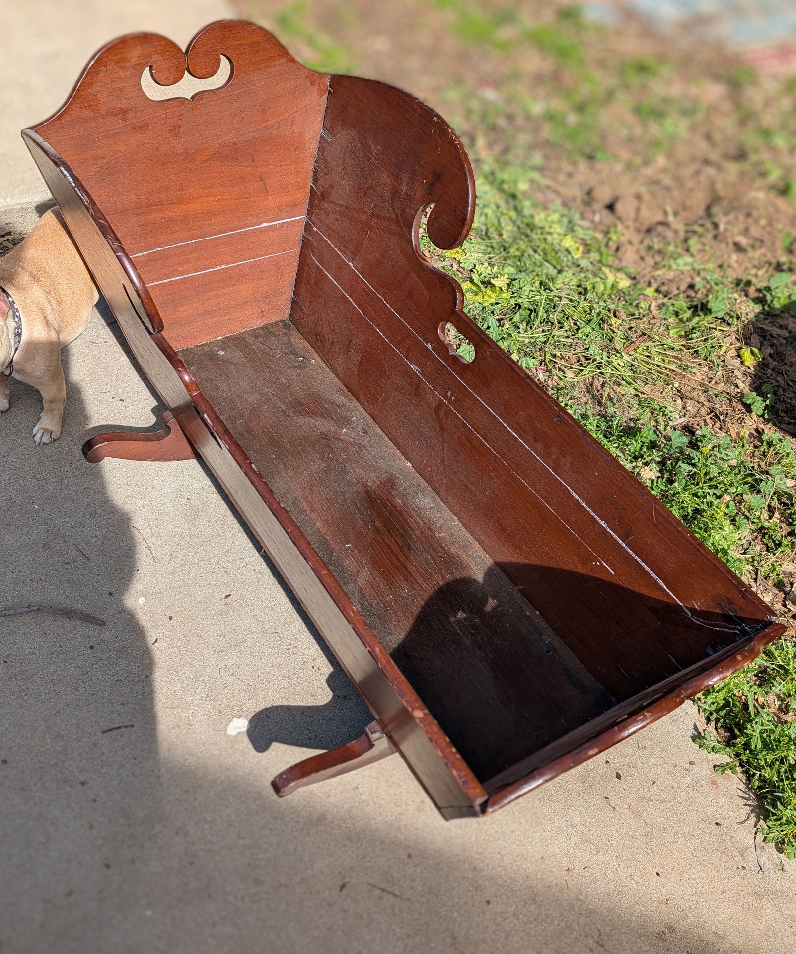 This well loved antique rocking cradle is looking for a new home. Perfect for any child's play room or collector. Finely Dovetailed Cradle 38" long 22" wide and 25" high, in good used condition, there are scratches as with any preloved items. Dovetailing on head and foot of cradle. Also the rocking foot at the foot of the cradle was repaired at some point, picture included, please keep that in mind. The chalk lines inside have been pledged off as you can see on the second picture.