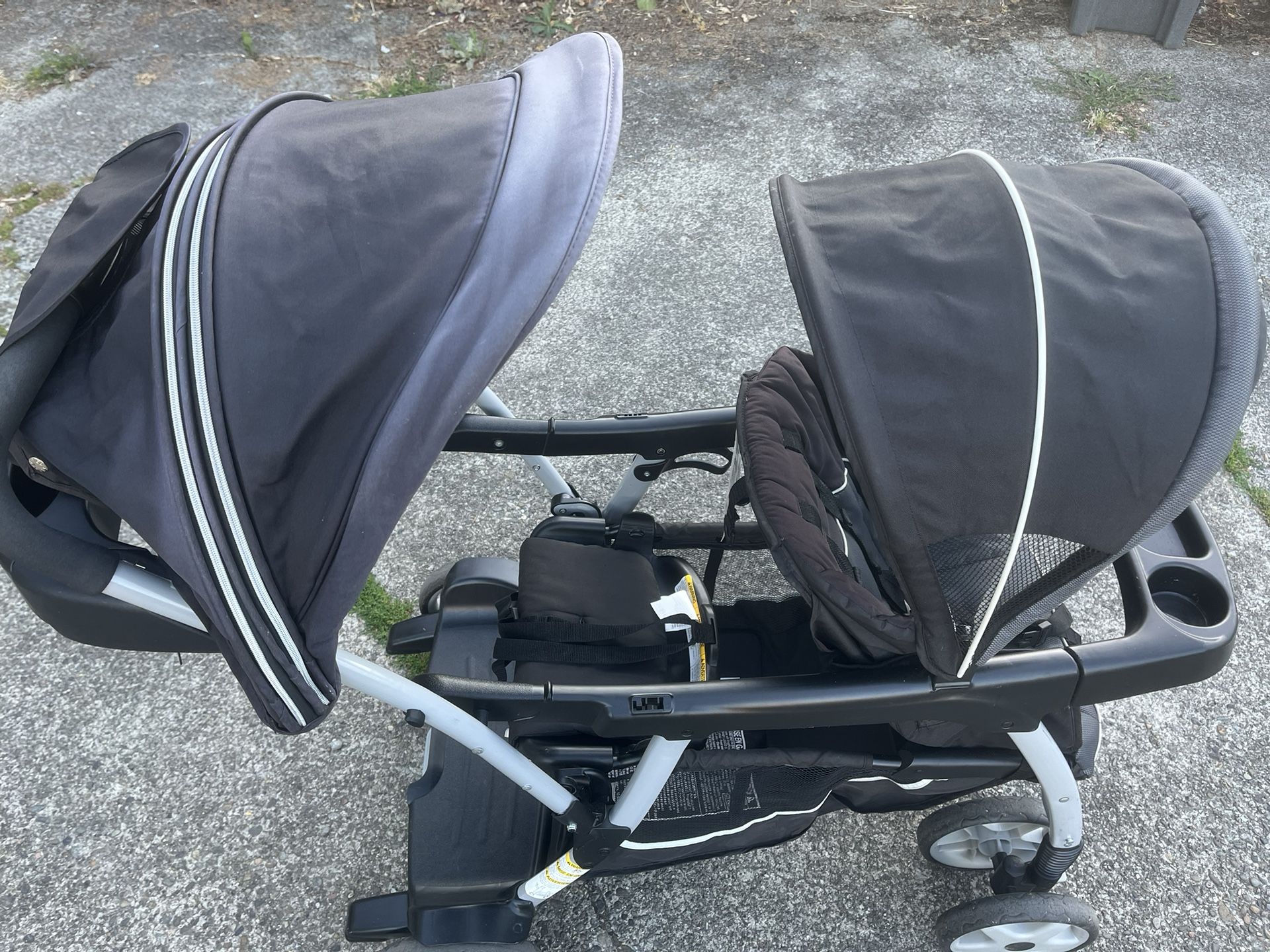 Very clean; ready to use Storage for diapers under the seats Double seating stroller Canopy for kid at the front & back (very large canopy for back seat & 2 zippers to adjust canopy size) Front seat can be adjusted to recline Cup holders at rear handle bar & for kid in front seat Easy to fold and unfold - stands on its own when folded Not heavy for a double stroller Very sturdy Never flat tires Sit & stand for child on rear seat Wheels lockable by pressing lock with foot -------CASH only ------- Pick up near Des Moines Elementary School (address to give when ready to pick up)