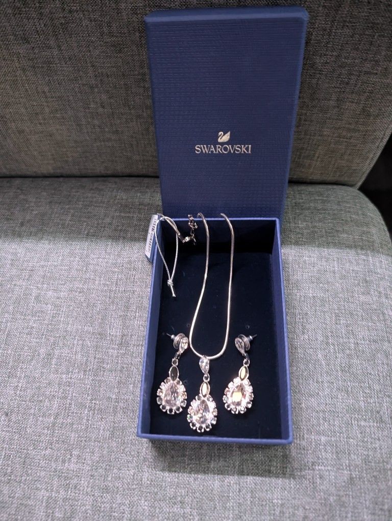 Brand new Comes in a blue Swarovski storage jewelry box.Original combined retail price is $275.00 .SIZE- 17" with a 2"extender, pendant- and earrings are approx 2" long..ARTICLE# (contact info removed) & (contact info removed) Authentic Swarovski Pendant and Matching Earrings!Called the Valeska pendant and earrings. Palladium plated pendant, tear drop bezel set stones in an array of colors ranging from jet hematite, to jet, and lastly clear crystals! The pendant hangs on a snake chain necklace with an extender. Swan logo stamped on the back of the pendant, Swan emblem on one side of the chain for authenticity!Palladium plated post earrings, identical to the pendant, have the branded earring backings and swan logo stamped for authenticity!