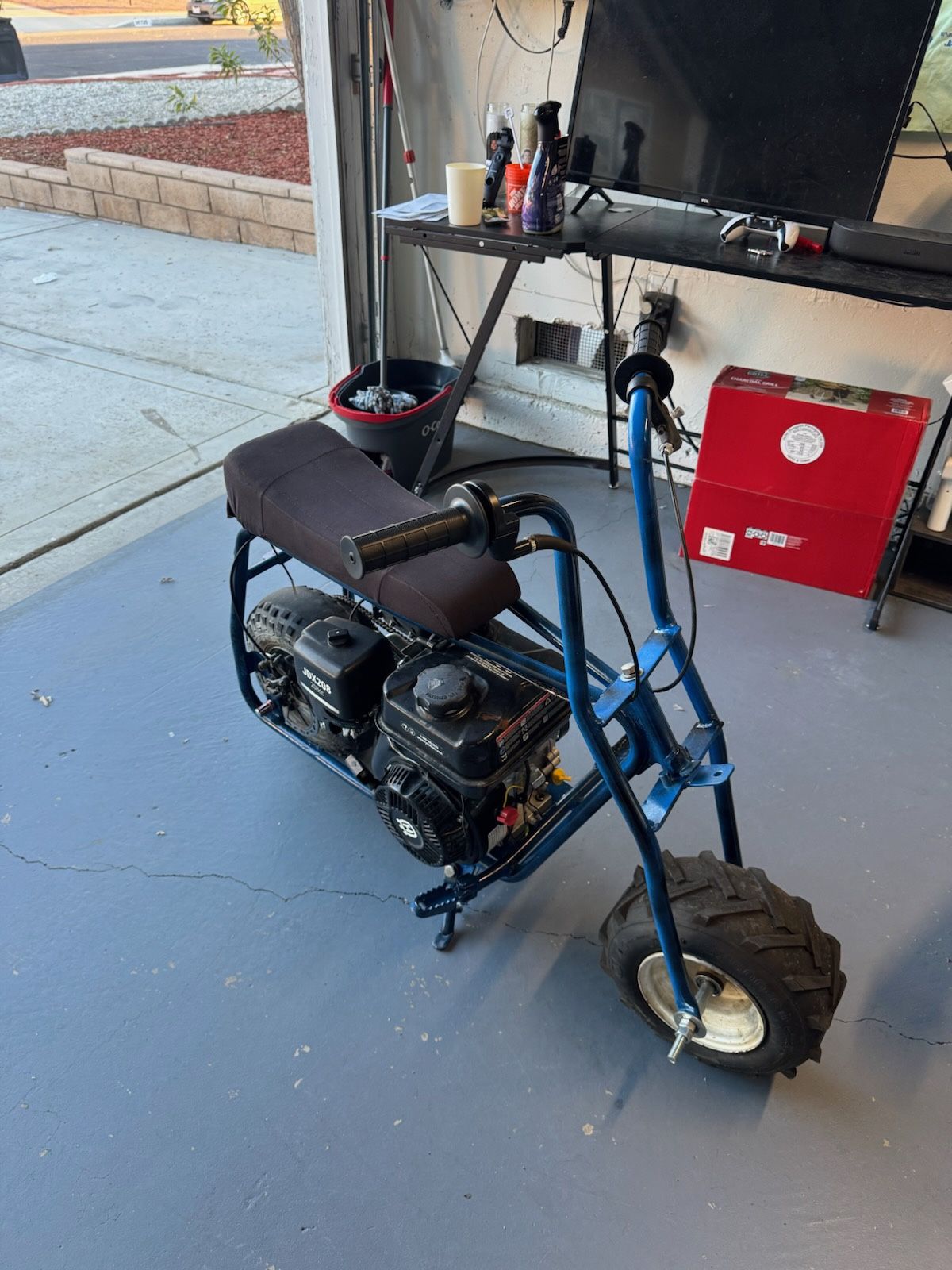 Hello this a my mini bike the frame is a Cole man I believe and it’s has hydraulic brakes fresh hosquvana motor and a new clutch haven’t had it for long