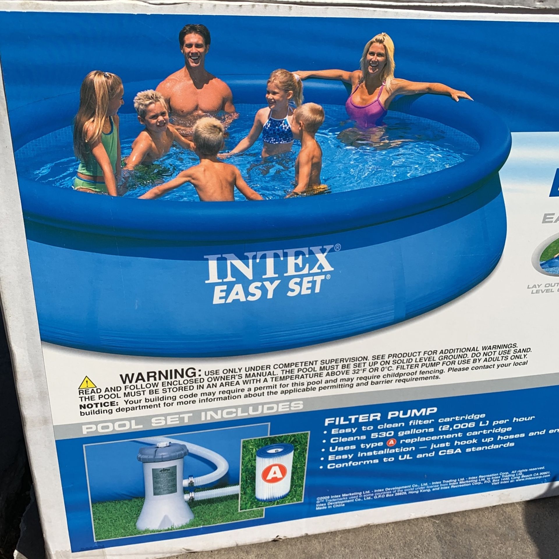 Intex Easy Set Pool 12’x3’ has some tiny holes in it but can easily be repaired. Still holds water well. Comes with ladder, filter pump, 1 filter, hose attachments, brush & skimmer attachments, chlorine tablets, chlorine tablet floater, pH product, 1 pack of shock maxblue pool shock and thermometer.