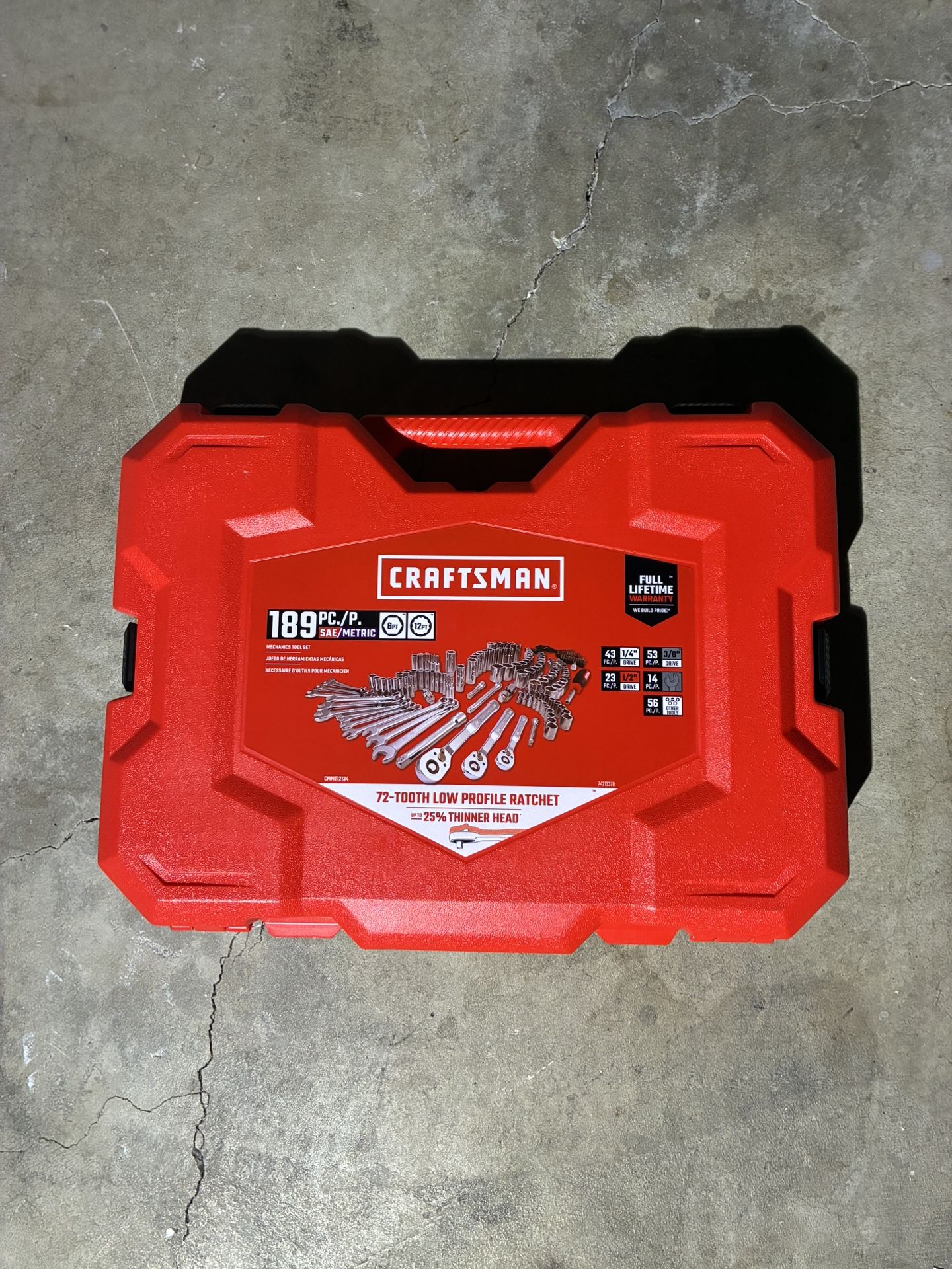 CRAFTSMAN 189 -Piece Metric and standard (SAE) Mechanics Tool Set with Hard Case Brand new. 12 sets available. Model #CMMT12134L Reatils for $190 at Lowes. Delivery available. Message for further details.