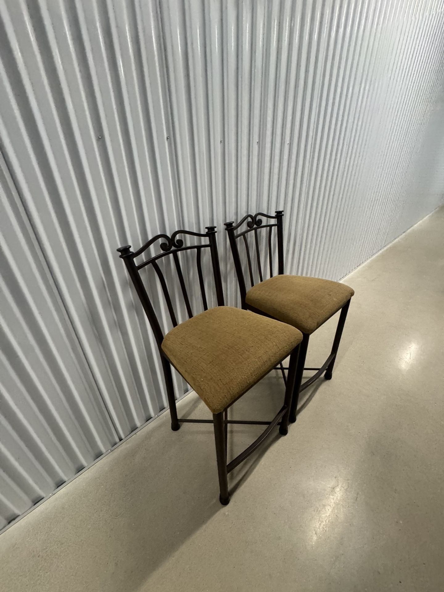 metal bar stools featuring a black finish and beige upholstered seats, chairs are in good condition pick up or extra for drop off (price depends on distance) Asking $100 but honestly throw me an offer and let’s see what we can’t work out!