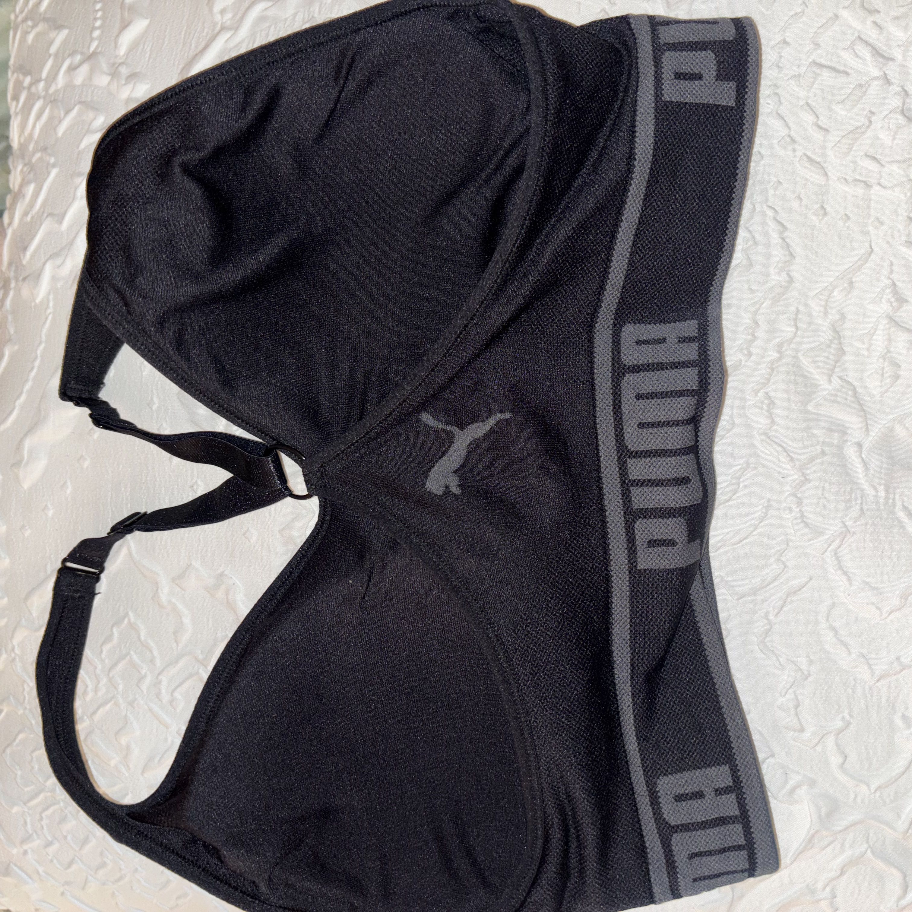 Black athletic sports bra with Puma logo and elastic band. Gray branded elastic waistband detail.