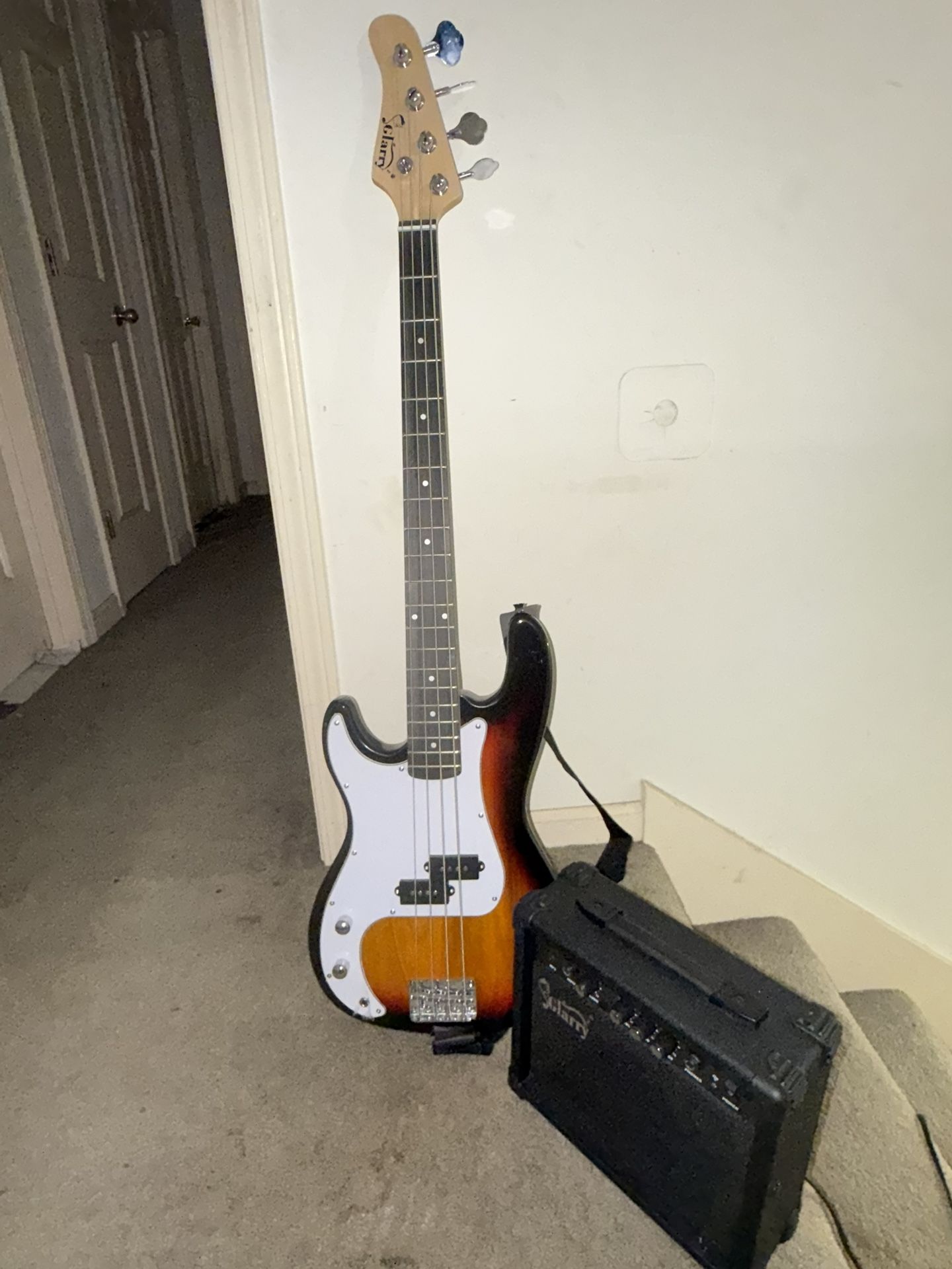 Glarry left-hand bass in sunburst (left-handed), plus Glarry practice combo amp and instrument cable. Played only twice — excellent condition, no dings, freshly cleaned and set up. Great starter/budget rig or spare bass. Includes strap and cable. Local pickup preferred