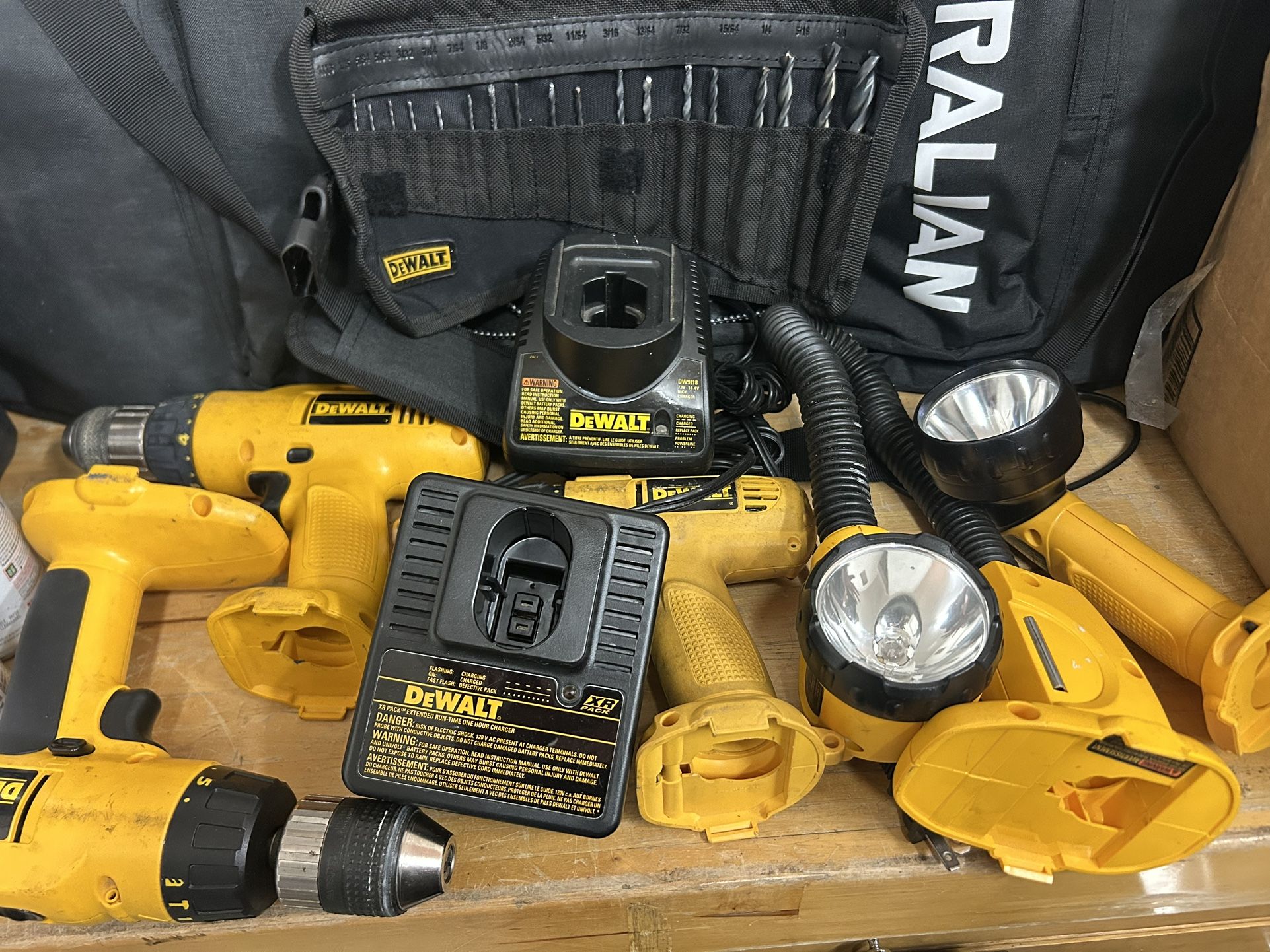 3 drills, drill bits, 2 battery chargers and 2 flashlights