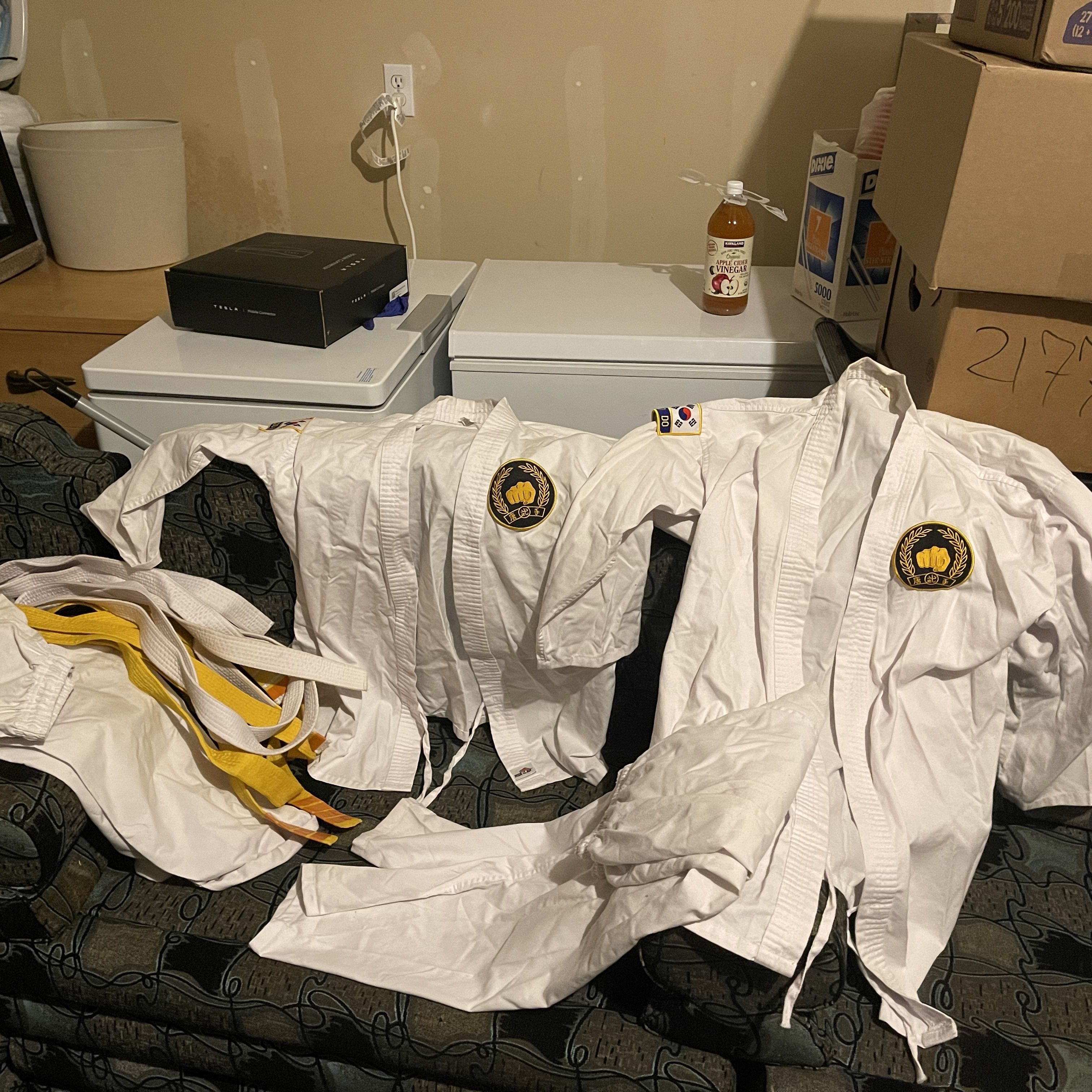 Traditional white martial arts uniforms with yellow ranking belts. Official patches on the uniforms.