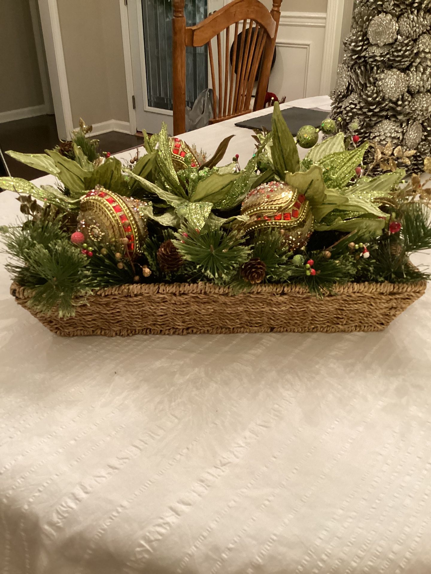 NEW Christmas centerpiece in basket with wood handles 20 x 14 x 6”
