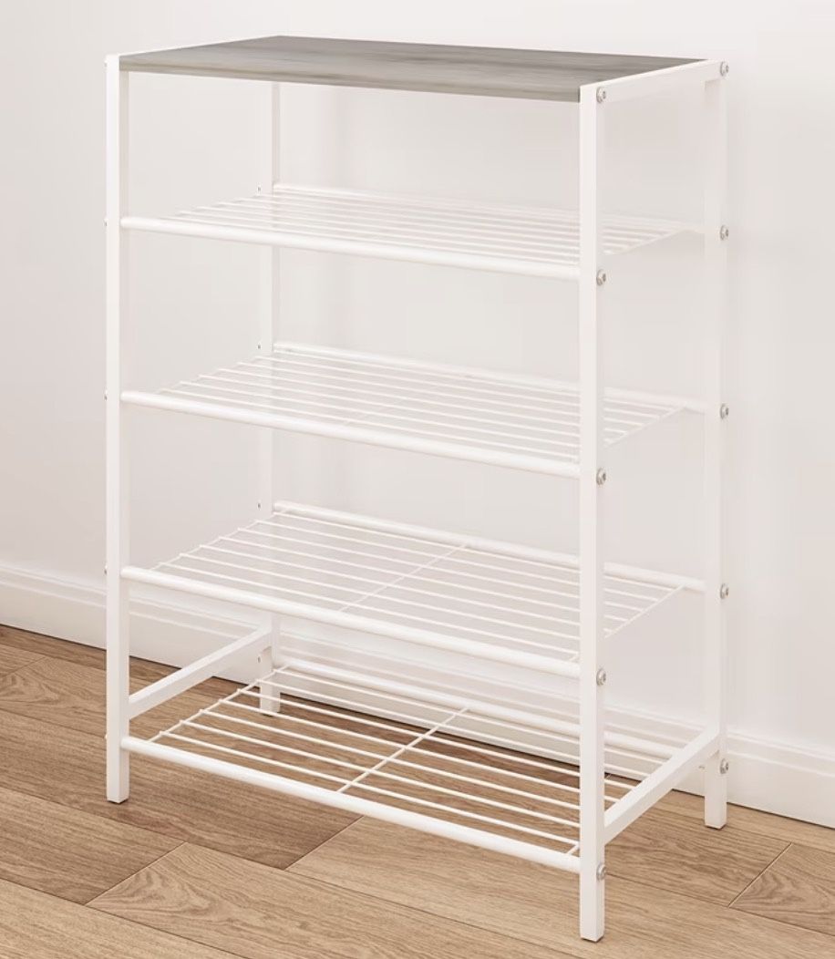 White metal shoe rack with a wooden top shelf. It's able to hold about 15 shoes