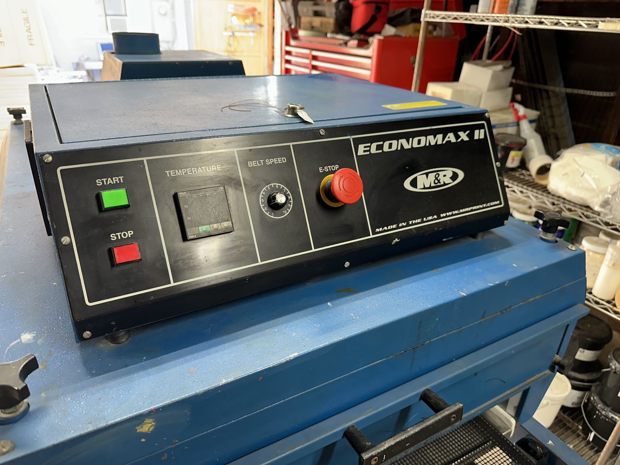 M&R Economax 2. 24" wide belt x 8 feet long. 2 large heat elements, both are adjustable in height. 220v electric with a plug. Works great. Strong and hot. (Can plug it in to demonstrate.) We ran our screen printing business in the garage for 18 years supporting our family even when the economy was slow. Having compact professional equipment that fit in a two car garage kept our over head low a was the key to weathering the ups and downs of the economy. This conveyor dryer is a real workhorse. A precision tool that will earn back your investment many times over. Screenprinting Screen printing Silk screen Silkscreen T-shirt printing T shirt printing Oven