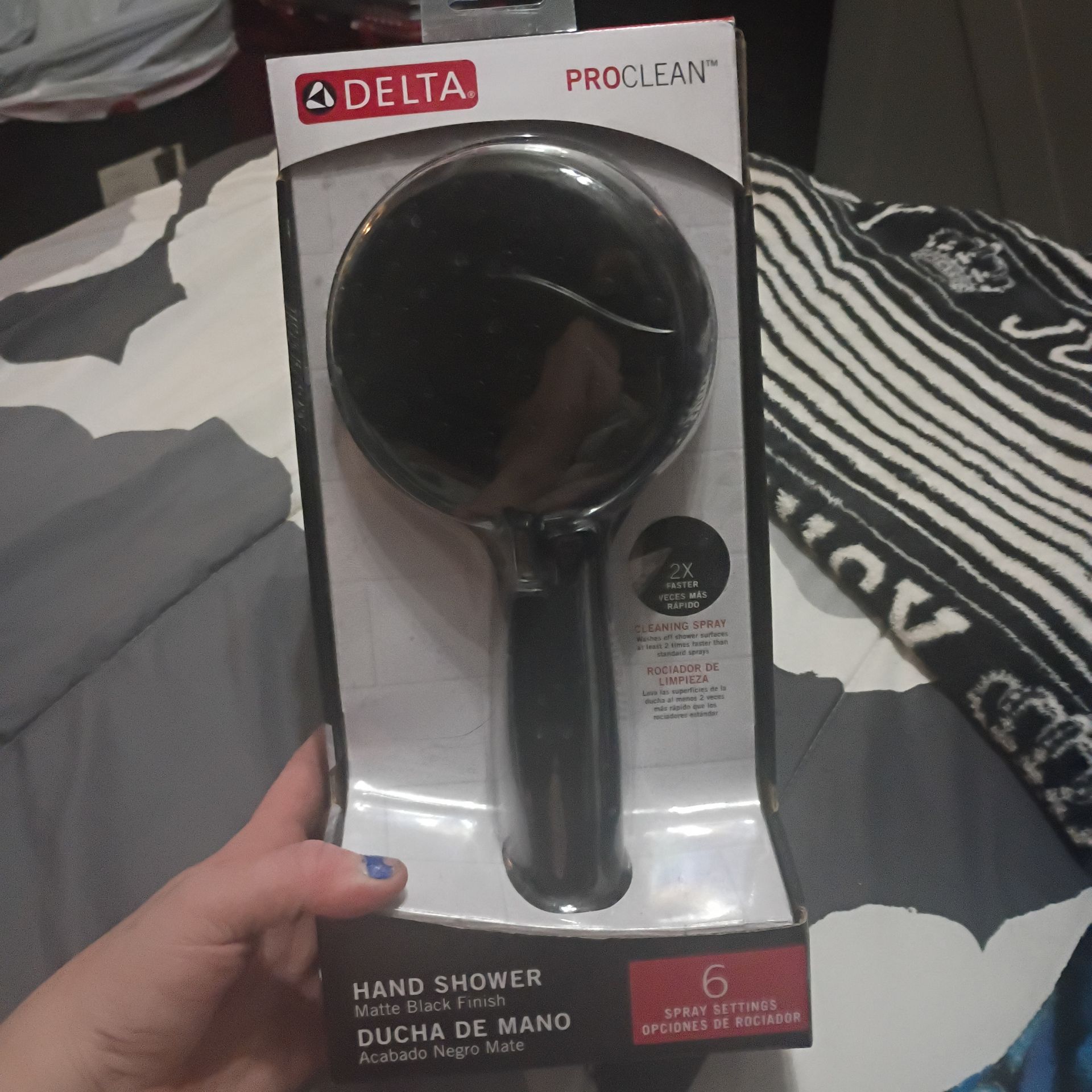 Brand new in box never opened Delta 6 spray settings -proclean spray cleans shower surfaces 2 xs faster -fullspray -fullspray + massage -massage spray -shampoo rinsing spray -pause Color is black. 50 o.b.o