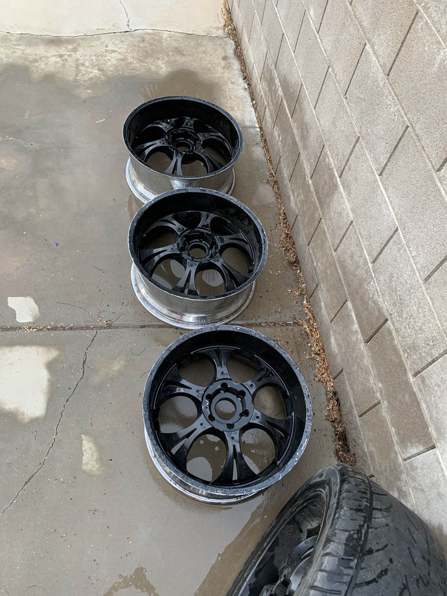 I have some black 22inch rims, the pictures do not do them justice. They have been sitting for a while. i rinsed them with water, i did not have time to actually wash them correctly. The 22s are for a chevy 6 lug. 6x5.5 One of the rims has a tire & i also have the other 3 tires that will come with the other 3 rims that do not have them on currently. please keep in mind i will not be holding for anyone whoever come first with cash takes them. If you have any questions please reach out. Thank you & have a great day.