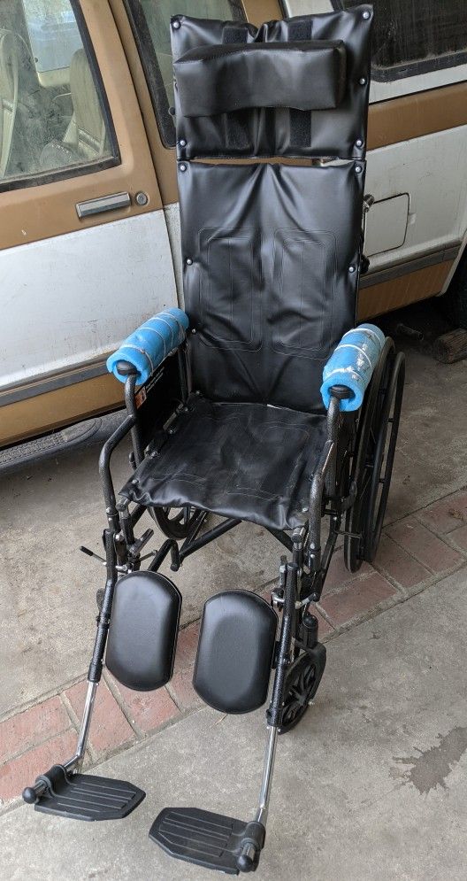 Pre-owned in good condition Everest & Jennings Advantage Reclining Wheelchair, High Back & Removable Headrest, 22" Seat. Comes with the blue extra cushions on elbow rest but can be removed. Complete with foot rests as well.