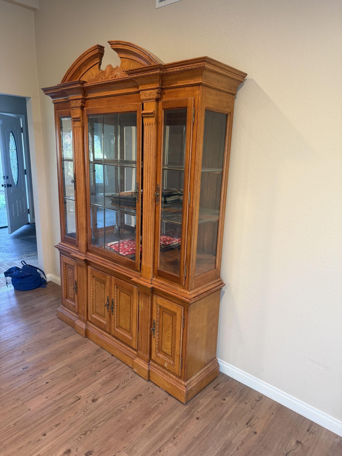 Separates top and bottom. Glass shelves. Below has a drawer and shelves with cupboards 5’x7’4” and 14” deep Gorgeous item.