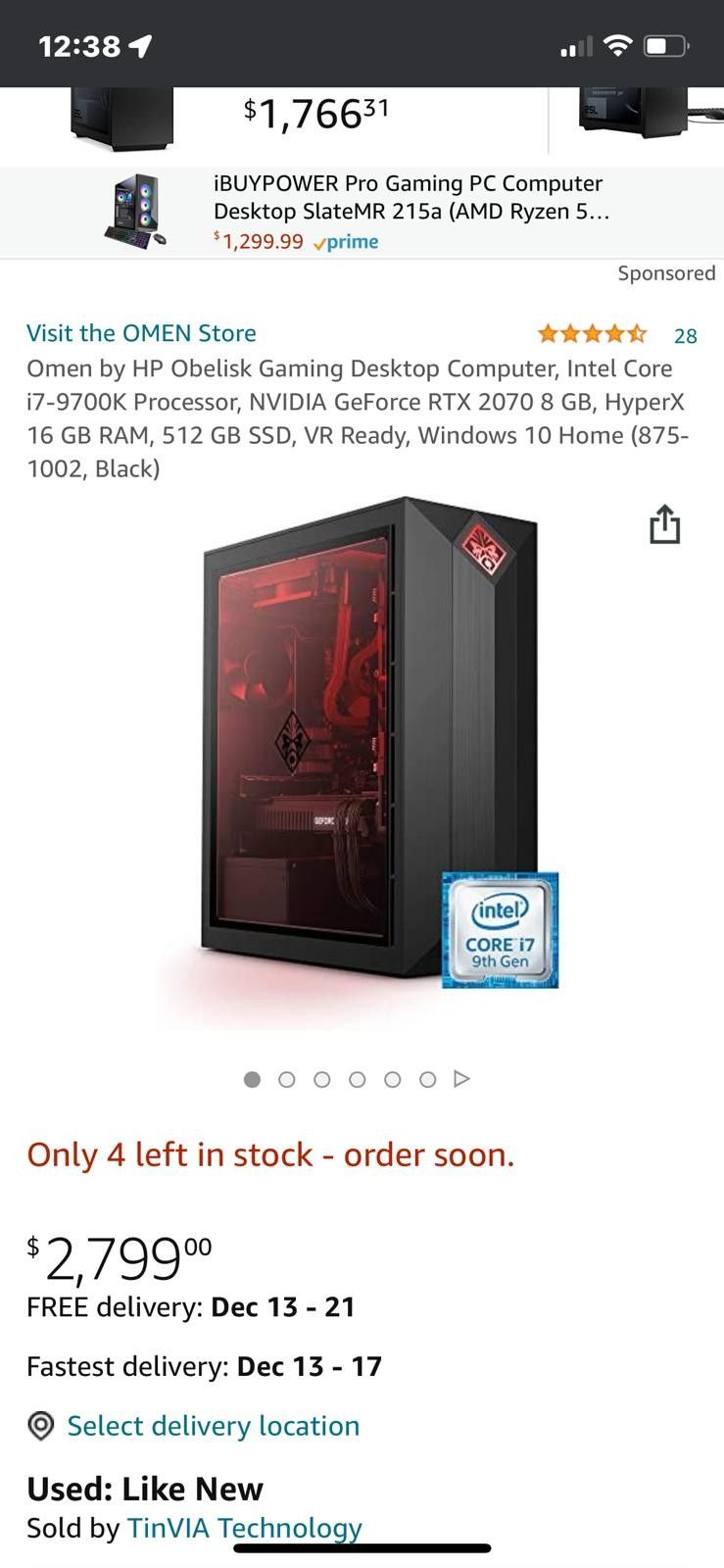 PC is brand new used for a few months before upgrading. HP OMEN Obelisk Gaming Desktop Computer, 9th Generation Intel Core i7-9700K Processor, NVIDIA GeForce RTX 2070 Super 8 GB, HyperX 8 GB RAM, 512gb ssd, VR Ready, Windows 10 Pro.