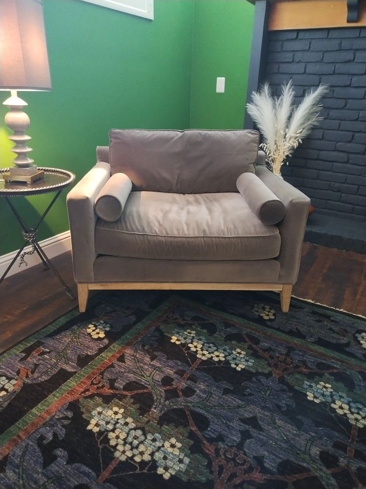 Beautiful modern down-filled cushions super wide and cozy for people of all sizes. Dove gray. Bought on Houzz for approx. $2,000.