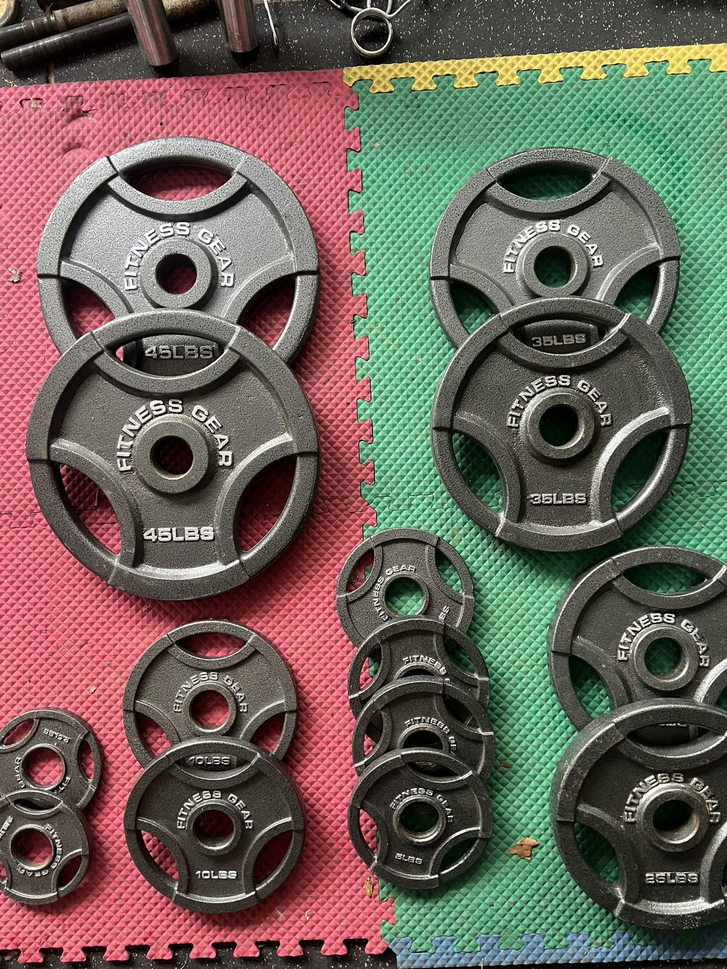 45lbs x 2 35lbs x 2 25lbs x 2 10lbs x 2 5lbs x 4 2.5lbs x 2 255lbs total Olympic, weights, gym, cardio, exercise , fitness , weight lifting , squat rack