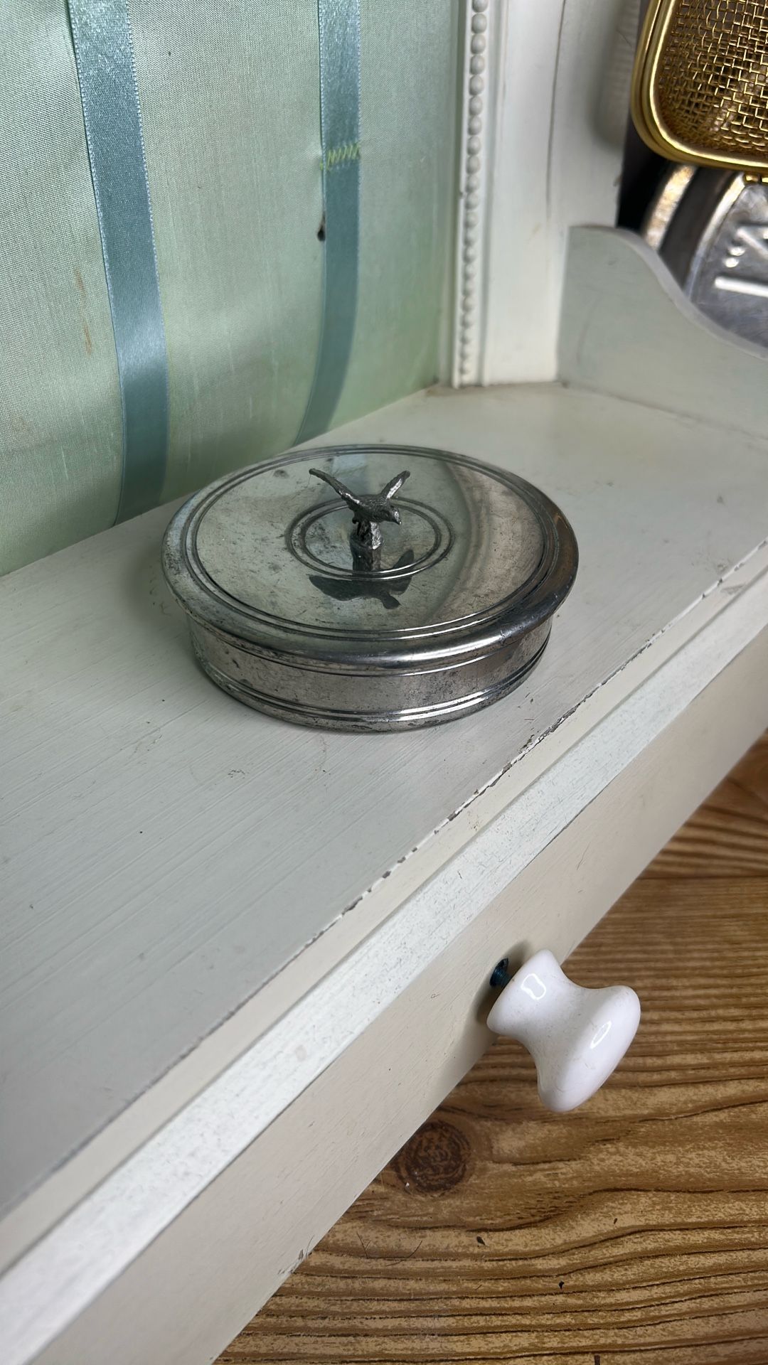 Each item is vintage metal or pewter. One is a candle holder. Other one is a pewter cigarette holder. Hard shape is a candy dish holder. Each item is very very heavy.