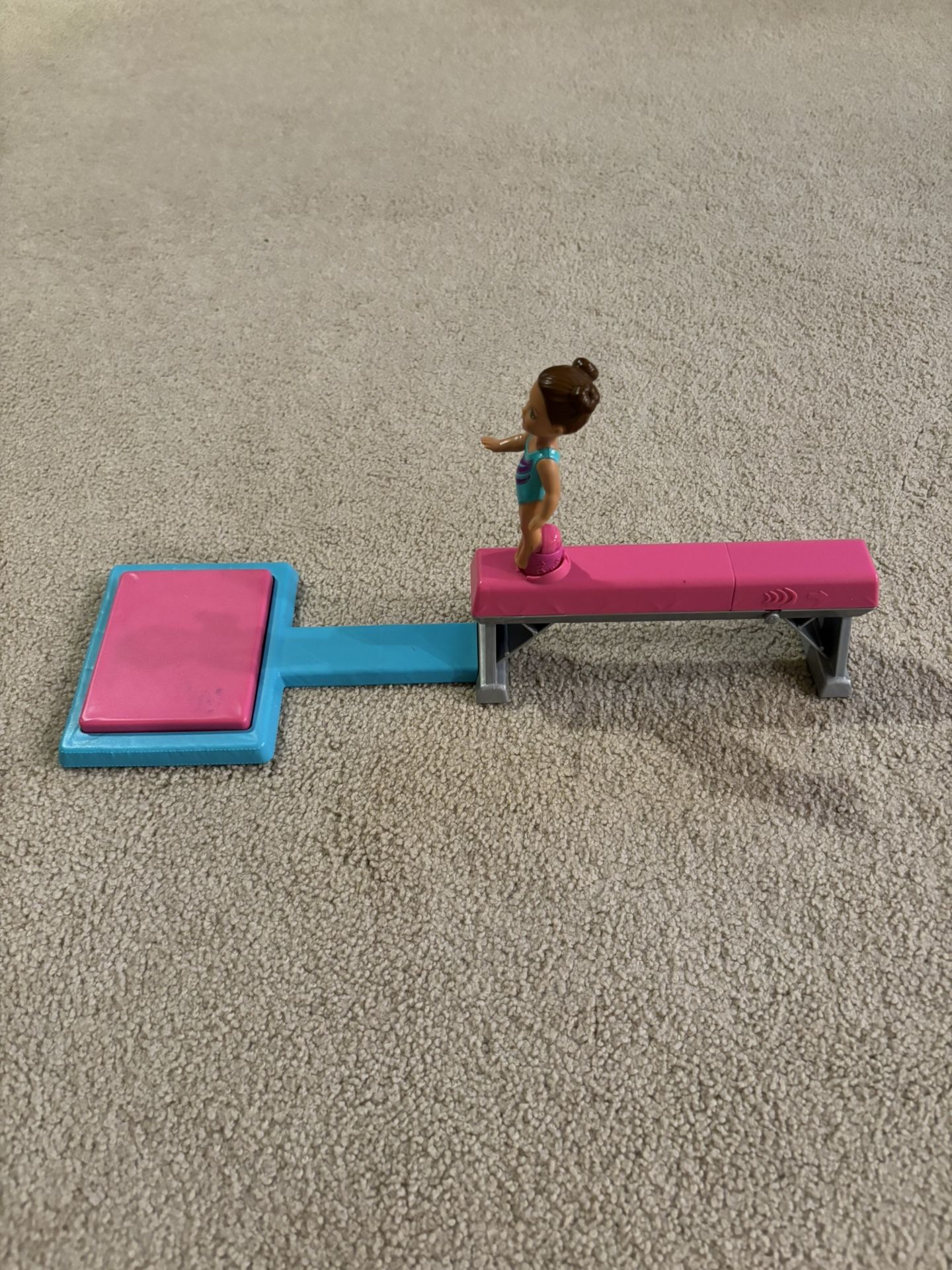 Flippin fun set Push a button and the Barbie gymnast flips and lands on the mat Barbie/gymnastics/girls/toys