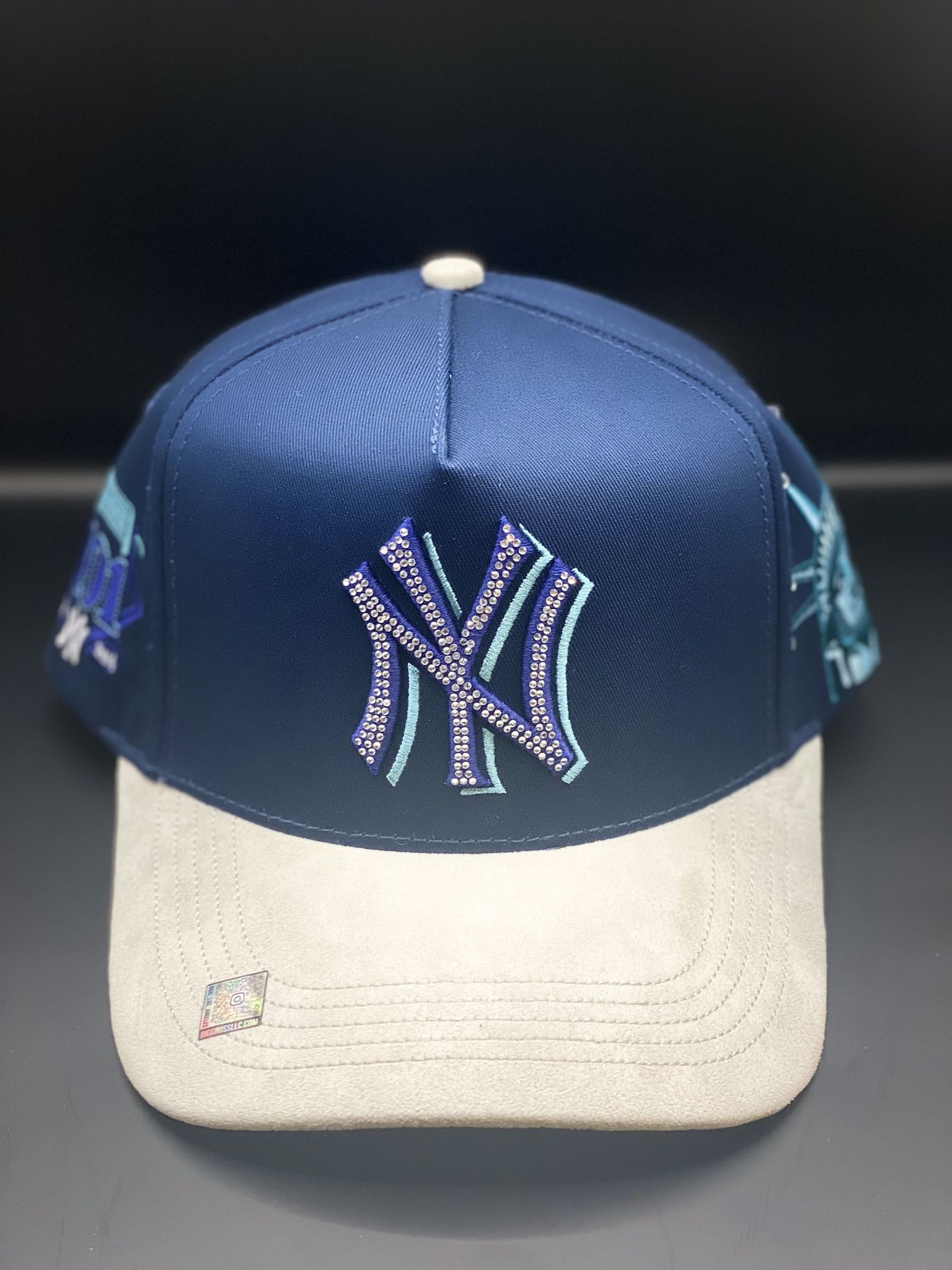 This is a stylish blue snapback hat featuring a solid beige suede material with a crystal NY design. It is a one size fits all hat that is adjustable for a comfortable fit. Perfect for various occasions👍 Esta elegante gorra azul snapback está confeccionada en gamuza beige lisa con un diseño de cristales de Nueva York. Es de talla única y se ajusta cómodamente. Perfecta para diversas ocasiones.