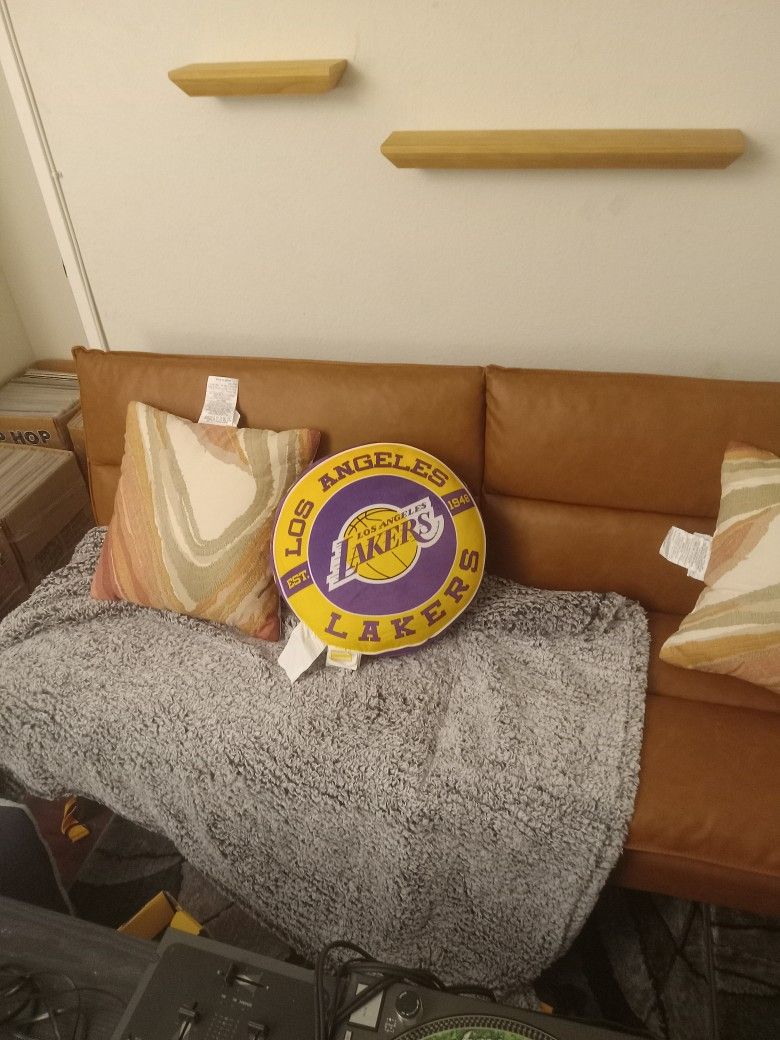 Mainstays Pillow Top Futon with 71.25in. x 33.46in. x 31.49in, Camel Faux Leather Comes w 1 LOS ANGELES LAKERS PILLOW