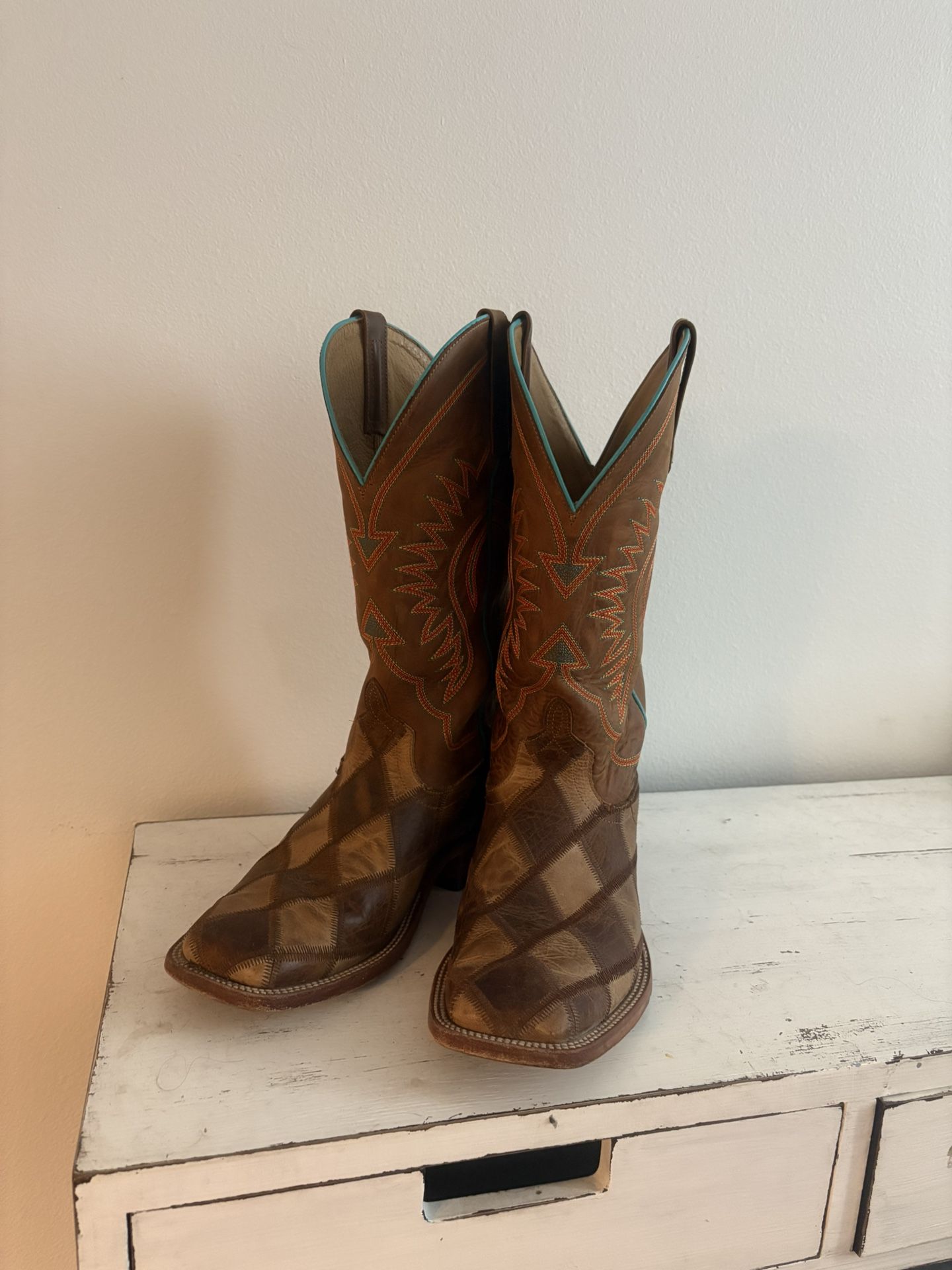 Selling a pair of Horsepower boots Men’s size 10 EE (wide fit) Patchwork design. Boots have been worn about 4-5 times. Just want a different pair. Have a blue stripe down the middle with red and yellow stitching on the shaft. Wood bottoms with a rubber heel. Really comfortable well made boot. The wood bottoms have some wear but nothing excessive. Boots are 250 new. $175 obo. Price negotiable