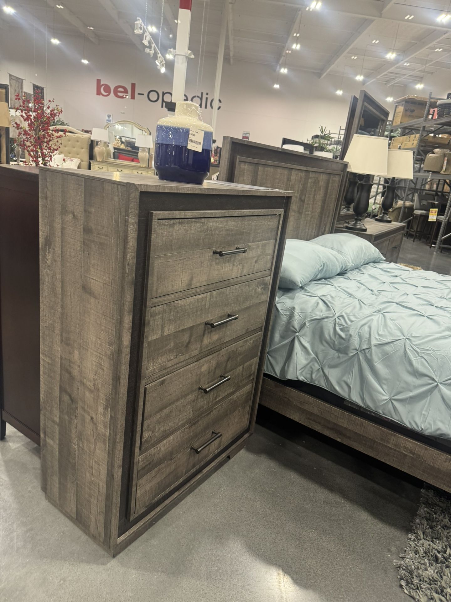 This chest blends rustic aesthetics with modern touches, creating a bedroom set that conforms to your home. A genuine wood-plank look is formed with embossed faux wood veneer and a mahogany finish, framed with 3D printed paper veneer in a dark ebony that contrasts with the overall tone of the pieces. The chest is accented with distressed, pewter-finished bar hardware. Dimensions: 35"W x 16"D x 49"H