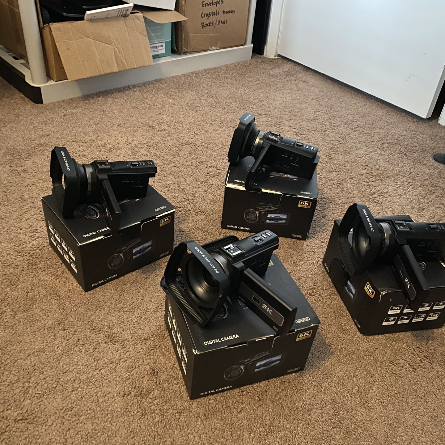 Must by all 4 camcorders for $200 price is firm. open box - all in great working condition. Great for streaming and multi angle podcasting or outdoor sports, and so much more. Features: 1. 5K/30FPS image quality, resolution up to 2880 x 5120, clearly present every image detail 2. High-performance COMS photosensitive chip, true restoration of image color 3. 48 million pixels, every detail is clearly visible 4. 6-axis physical image stabilization, dynamic shooting is smooth and clear 5. F/2.2 large aperture lens, quickly lock wonderful moments 6. 16X digital zoom, clear and visible long-range view 7. WiFi connection transmission, support connection to mobile phones Product parameters: 1. Image sensor: 8 million pixel CMOS sensor (up to 48MP interpolation) 2. Image resolution: 48M (8000 × 6000); 36M (6880 × 5160); 24M (5600 × 4200); 20M (5120 × 3840); 16M (4640 × 3480); 12M (4032 × 3024); 8M (3264 × 2448); 5M (2592 × 1944) 3. Video resolution: 5K 30FPS; 4K 30FPS; 2.7K 30FPS; 1080P 60FPS; 1080P 30FPS; 720P 60FPS; 720P 30FPS 4. Lens angle: 88 degrees 5. Anti-shake: 6-axis anti-shake 6. File format: Photo-JPG, Video-MP4 7. LCD screen: 3.0-inch IPS display, capacitive touch, 270-degree rotation 8. Cache: 2Gb DDR3 9. Lens: Ff (F/2.2 f=3.37mm) The smaller the aperture, the more light enters and the greater the depth of field 10. Flash memory: N/A. 11. External memory: SD card slot (up to 128GB), supports SDXC C10 U1 level and above 12. Extended memory card: SD card slot (up to 128GB), supports SDXC C10 U1 level and above 13. Microphone input: Supported 14. USB: Type C USB2.0 15. Power supply: Rechargeable lithium battery 16. Selfie: Single shot/2-second timer/5-second timer/10-second timer 17. Infrared LED fill light: Yes 18. Exposure control: Exposure compensation-2.0EV 19. Zoom: 16x digital zoom 20. Auto power on: Turn on the screen and turn on synchronously 21. Auto power off: Off/1 minute/3 minutes/5 minutes 22. Date setting: Off/On/Set date 23. Metering mode: Center/Multi-point/Point 24. White balance: Auto, Daylight, Cloudy, Incandescent, Fluorescent (H), Fluorescent (L) 25. Photo: Photo/Timed photo/Photo continuous/Time-lapse photo 26. Video: Video/Slow motion video/Loop video/Time-lapse video 27. Shooting distance: 1 meter to infinity 28. ISO sensitivity: Auto/100/200/400/800/1600/3200 29. Shutter speed: 1/10 sec-1 /2650 sec 30. Transmission method: WiFi/OTG 31. Supported languages: English, Simplified Chinese, Traditional Chinese, Japanese, Korean, French, German, Italian, Spanish, Portuguese, Russian, Polish, Vietnamese 32. Product size: 120 x 58 x 60mm 33. Product net weight: 262g (excluding battery)