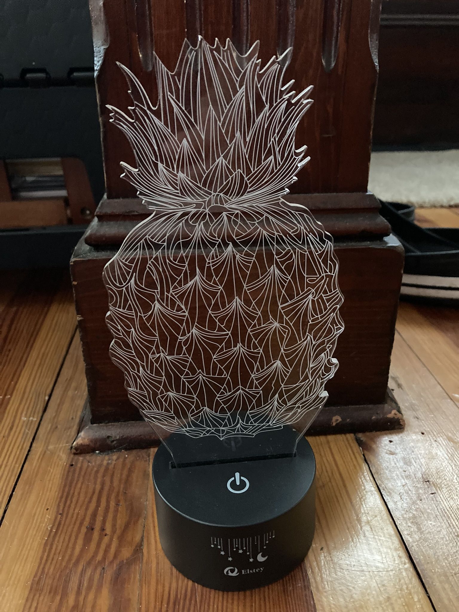 Pineapple is acrylic. There are 8 color modes. Plugs into USB block/port.