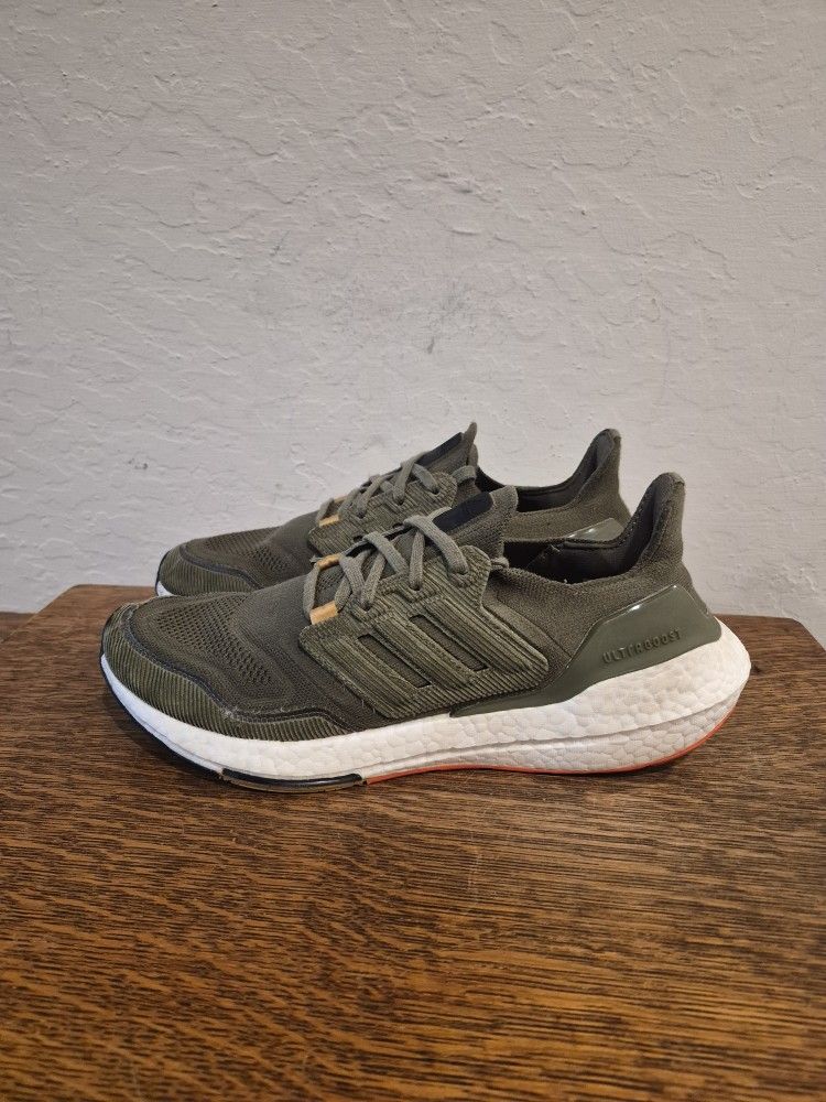 Adidas Ultraboost 22 Athletic Running Shoes Men's Size US 9.5 UK 9 EUR 43 1/3 Cm 27.5 Focus Olive Green and Semi Impact Orange colorway.