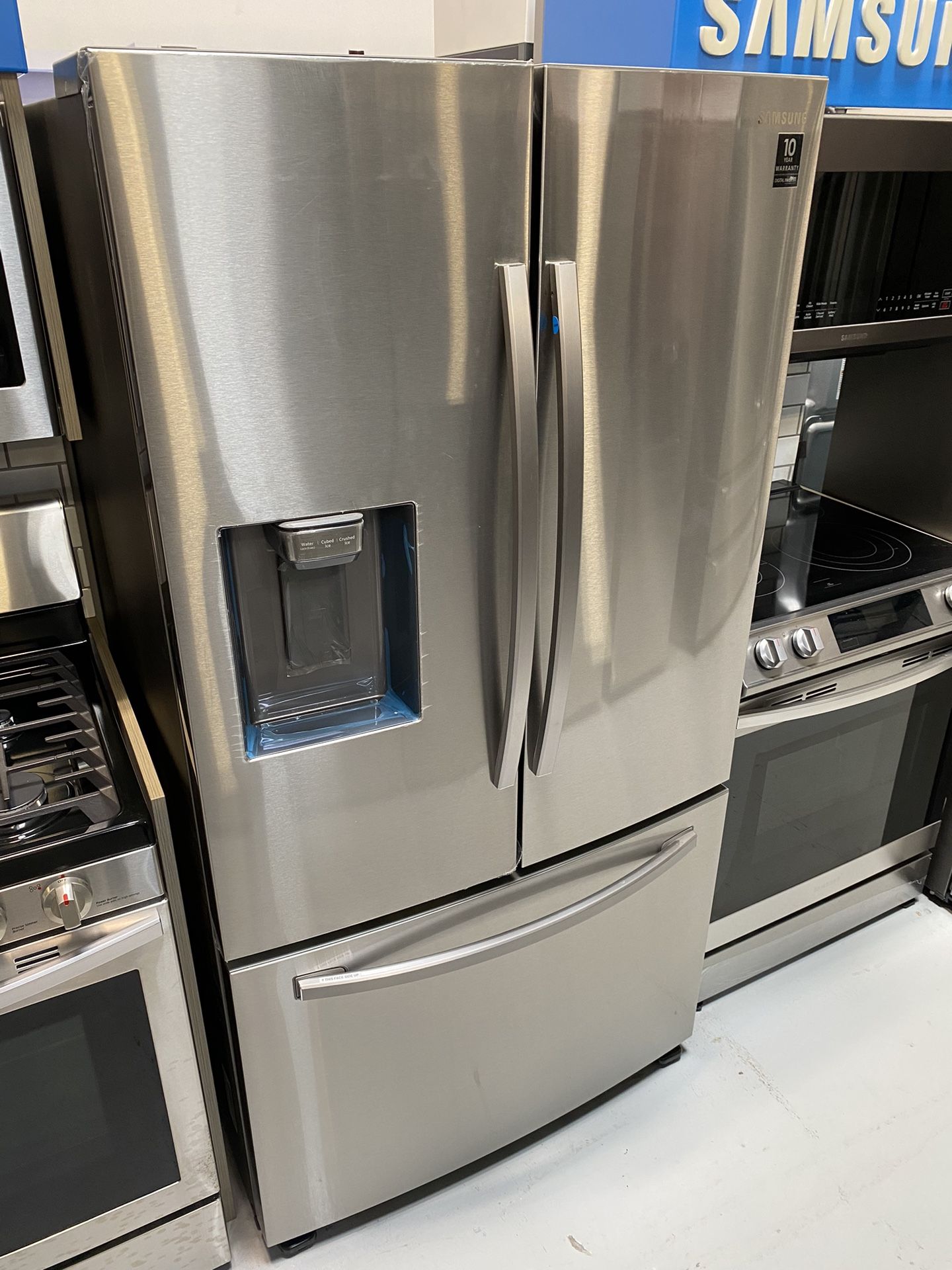 New Samsung Stainless Steel 27 Cu. Ft. 3-Door French Door Refrigerator With External Water & Ice Dispenser Model #RF27T5201SR Dimensions: 35.75”W 35.375”D 70”H Beautiful design. Minimal dispenser. Sleek-edge doors. Modern handles. Fingerprint Resistant. Large Capacity. Includes a 12-month warranty Financing Available Delivery and installation available Contact us with any questions or to stop by to see this unit and others. Open Monday - Saturday 10am - 6pm Our inventory changes daily. Message us for availability.