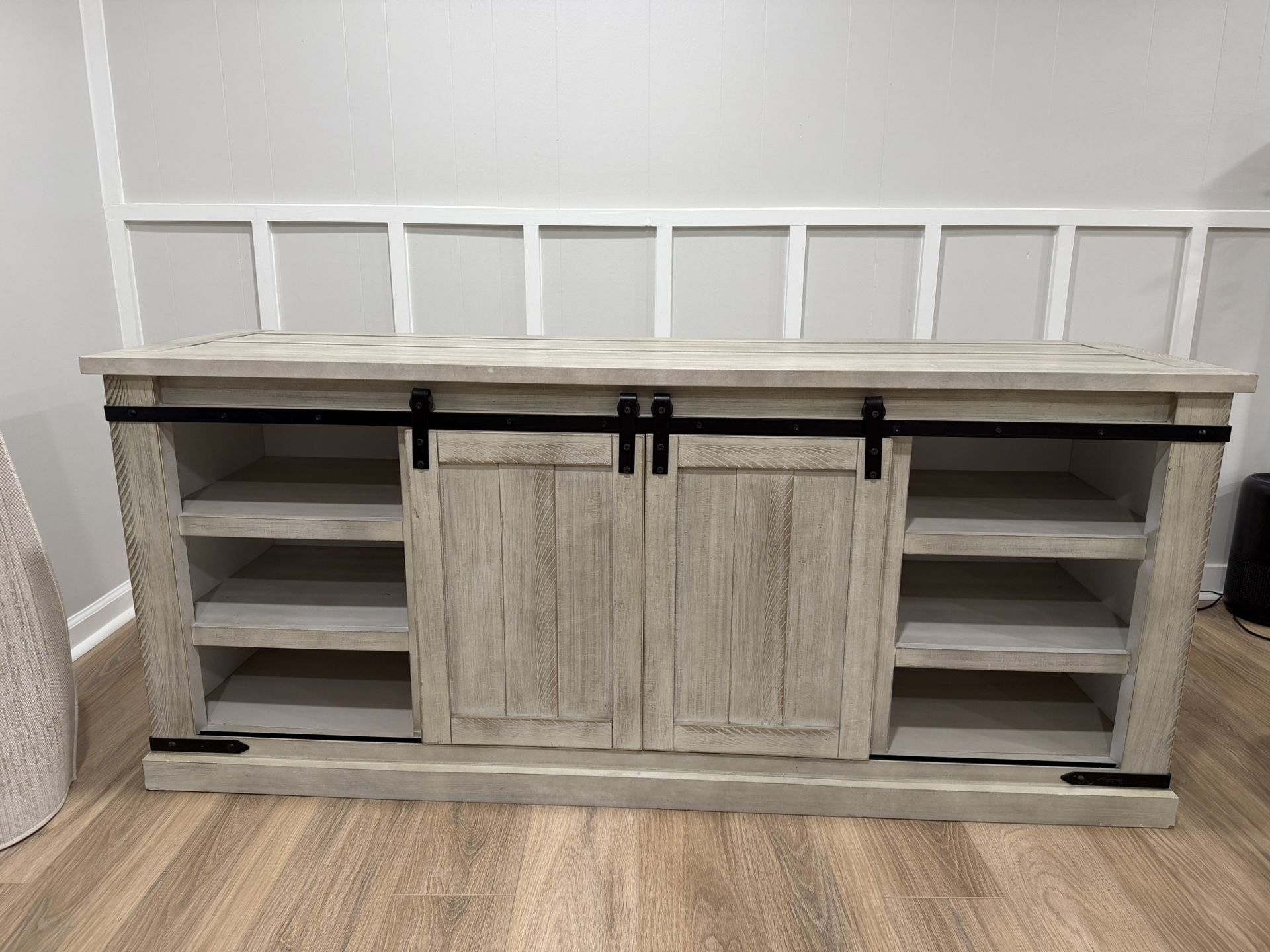 Modern TV stand with a clean, minimalist design. Features smooth sliding doors that reveal spacious shelving for media devices, gaming consoles, and storage. Finished in a neutral light wood tone that fits easily with modern and contemporary décor. This TV stand is like new and was not used. No damage, or odors. Kept in a clean, smoke-free home. Sturdy, well-built, and perfect for a living room, bedroom, or entertainment space. Starting now at 200, price is negotiable.