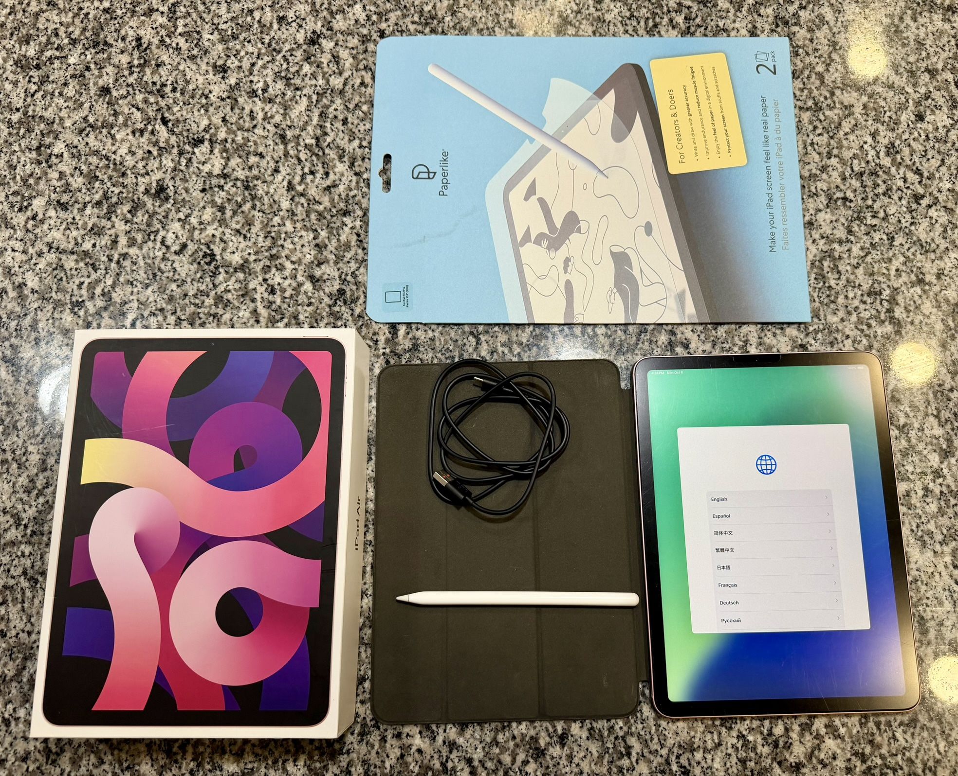 Selling 4th generation iPad Air in pristine condition. The iPad is rose gold, 256gb and has WiFi + Cellular option. Unlocked for any carrier. Included is genuine Apple Pencil, folio case and 2 paper like screen protectors (one is applied) and extra one in box. Has the original box and a USBc charging cord.