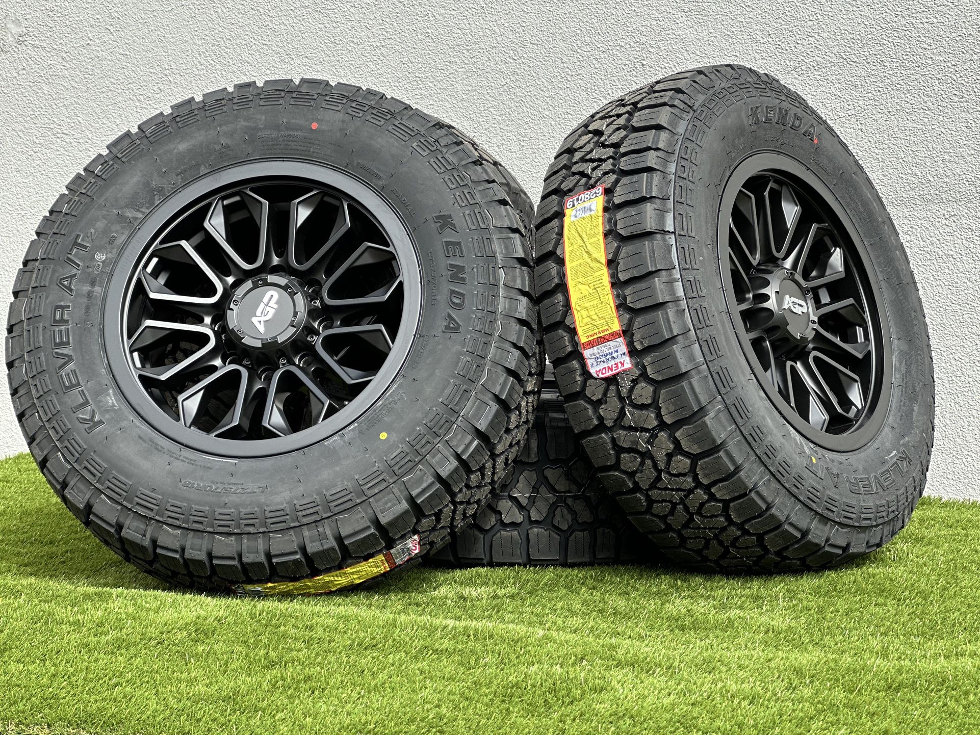 2025 NEW 18” Ford F-350 Matte Black factory Aluminum wheels (will also fit Ford F-250), wrapped in nice All Terrain LT 275/70R18 A/T Kenda Klever Tires Range Load E. Rims are 18x9.0J with a slight positive offset ET+12mm (negative offset is also available ET-18mm). Comes with all 4 center caps. Tires are New, nice Kenda Klever All Terrain LT275/70R18 Load Range E, 10ply, M+S. Great for off road, mountain, mud, and snow conditions backed by a 50,000 mile limited manufacturer tread life warranty. 8 lug bolt pattern 8x170 mm (8x180 and 8x6.5 also available) Price is $1795 before tax Installation, test fitment, lug nuts, and different frequency TPMS sensors are available. Cash, Zelle, or Card (+2.6%) is accepted Will fit all Ford F250 and F350 trucks like: Platinum, super duty, XL, XLT, Lariat, King Ranch, Limited, and of course Tremor. These will be a perfect fit for 2004-2025 models, but for 1(contact info removed) models, may need 2" adapters or spacers will be needed to prevent interference with the front leaf springs