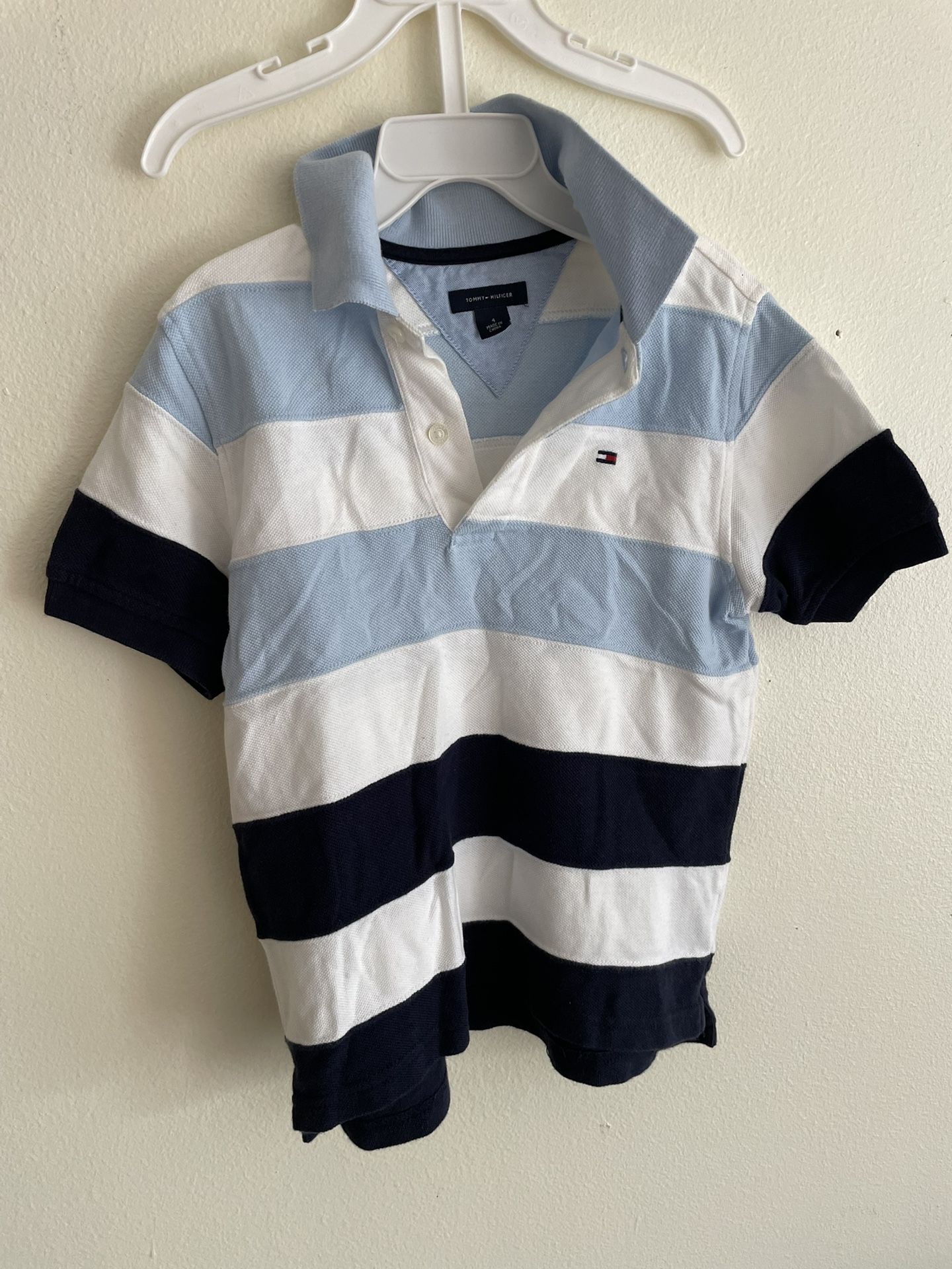 This is a Tommy Hilfiger brand children's short-sleeved polo shirt with a collar. • On the chest, there is a classic red-white-blue small flag logo. • Design: It adopts a classic wide stripe design, with colors consisting of sky blue, white and navy blue. • The material is typical pique cotton fabric, which has good breathability and is often used in sportswear and casual wear. • Size: The label on the collar indicates the number "4", which usually corresponds to children's size and is suitable for children around 4 years old. • Origin: The label states "MADE IN CHINA" (Made in China).