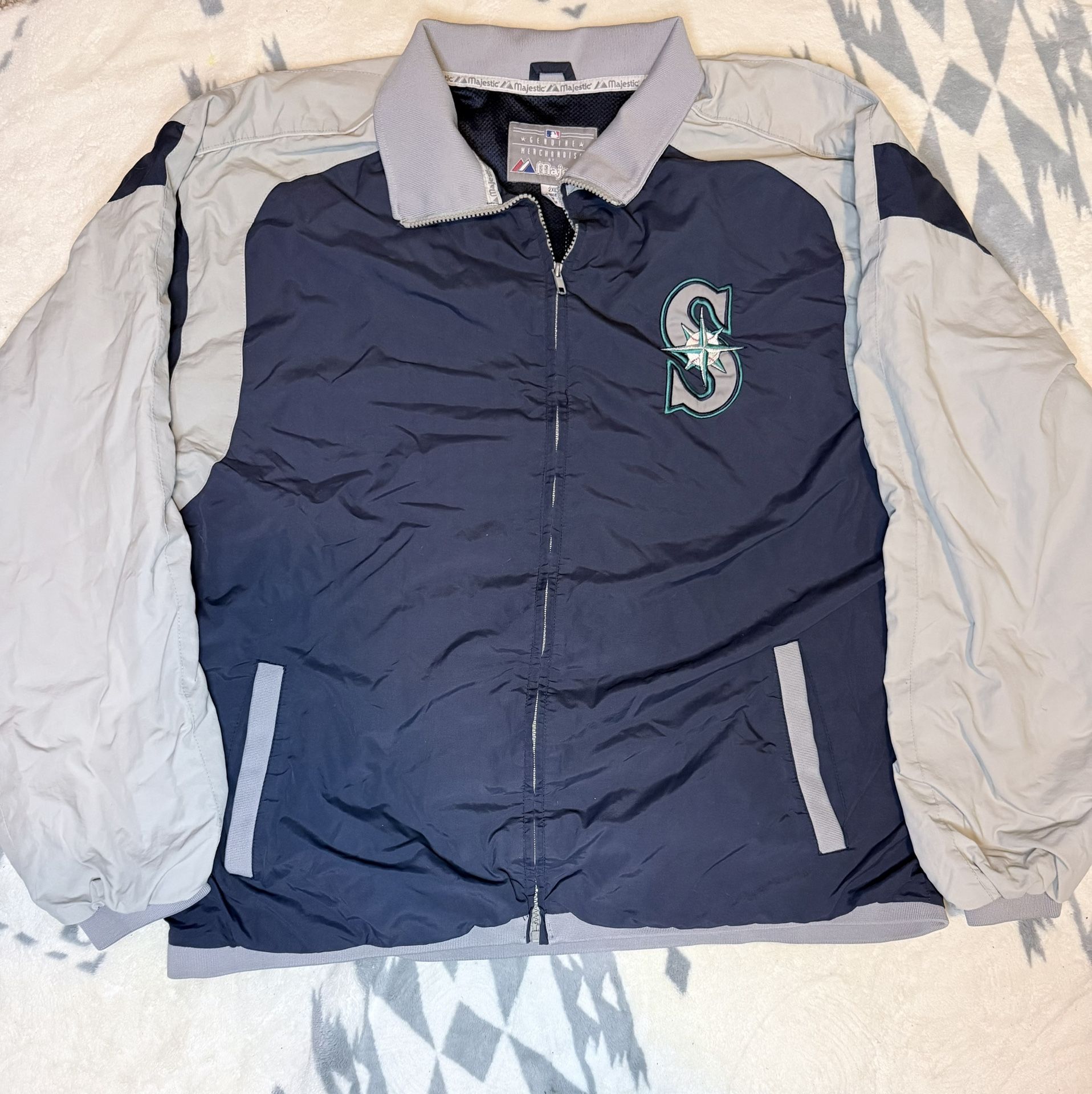 This Vintage 2000s Majestic Seattle Mariners MLB Windbreaker Jacket in size rare 2XL is a nostalgic piece of fan apparel perfect for any baseball enthusiast. Full Zip mesh lined. Spellout logo on back and “S” logo on front. Embroidery patch work. Amazing condition no tears, rips, wholes. Non smoking Measurements in photos. Officially licensed by Major League Baseball, this blue jacket features the iconic Seattle Mariners team logo, making it a must-have for male fans. The jacket is ideal for wearing during the regular season games to show support for the team in style. Made by a trusted brand like Majestic, this retro windbreaker is a great addition to any fan's collection.