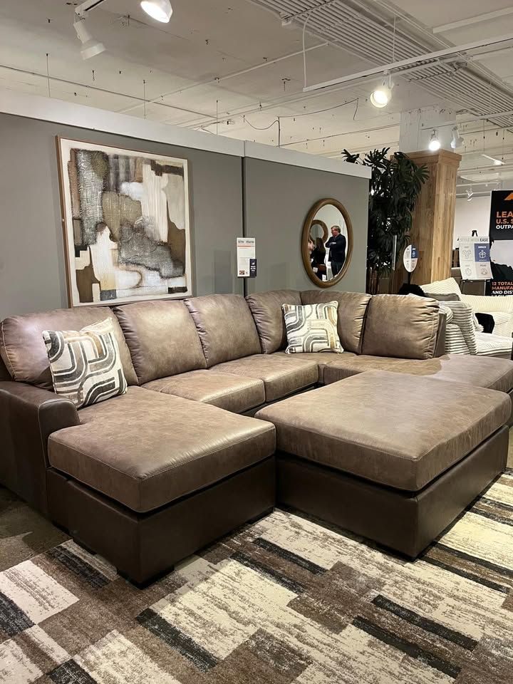 Features Sleek sectional with chaise is defined by supple faux leather in contrasting rich brown hues Attached back and loose seat cushions creating a stylish monochromatic look with dimension Accent pillows included Pillows with soft polyfill Faux leather upholstery Available w/Left & Right facing Chaise 2 Pc Large Sectional @ $1175.00 Ottoman can be purchased separately Dimensions: 122" W x 86" D x 39" H We offer various finance plans $39 down same as cash with no interest for 90 & 100 days. Longer financing plans are also available. Lowest prices, great quality products and exceptional service guaranteed. We also have a wide range of other living room, bedroom and dining room products to choose from at highly affordable prices. For buying visit Splendid Furnishings located at 4073 Lavista Road, Suite 311, Tucker GA 30084 or call 470-269-9301.