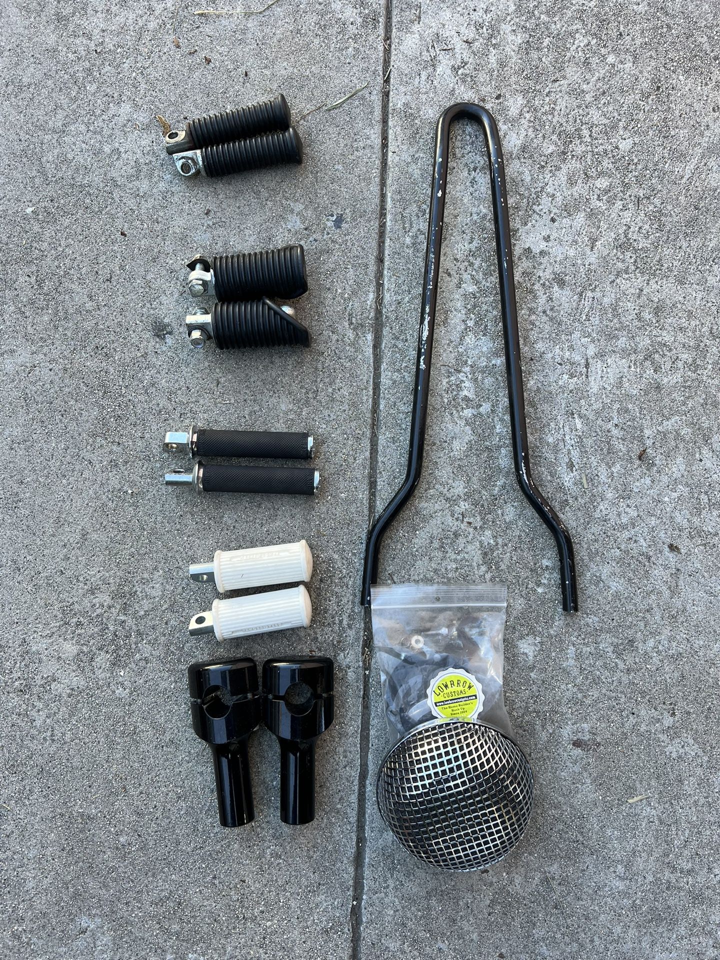 Misc. Harley parts: -Roland Sands pegs (black) - HD pegs standard (black) - Sissy bar w/o bracket - HD Risers (black) Make me an offer on any or all