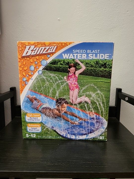 NIB Banzai 1016366 Speed Blast Water Slide The NIB Banzai 1016366 Speed Blast Water Slide is designed for children aged 5-12 years old. This water slide is manufactured by Banzai, known for their outdoor toys and structures. The Speed Blast Water Slide promises hours of fun and excitement for kids as they slide down and splash into the water. Perfect for hot summer days, this water slide provides a thrilling way for children to cool off and enjoy the outdoors.