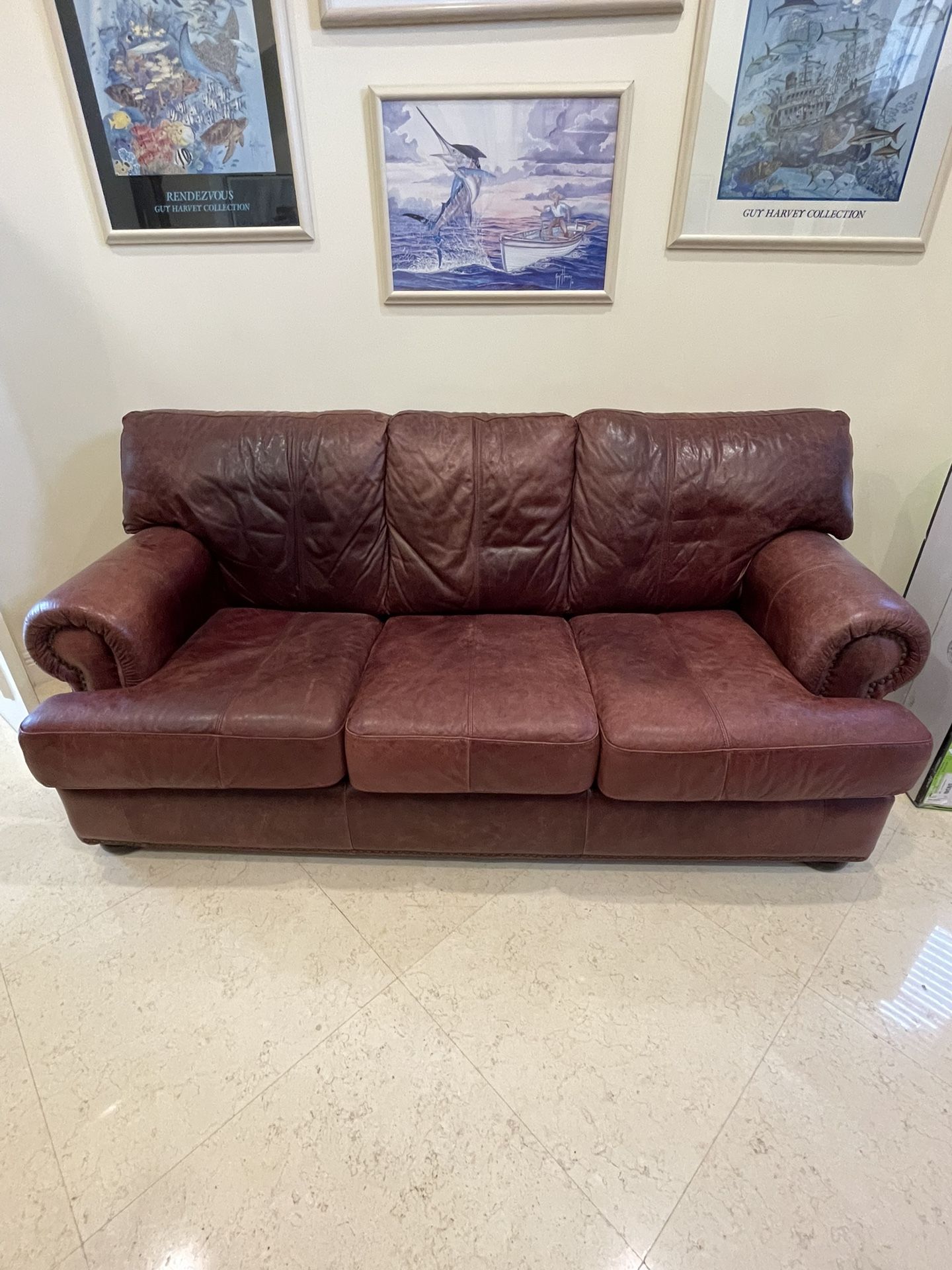 Leather couch, distressed, leather look in burgundy color. Very good condition. Couch is extremely soft and comfortable. Asking only $100 Couch cost over $2000 new when bought from rooms to go.