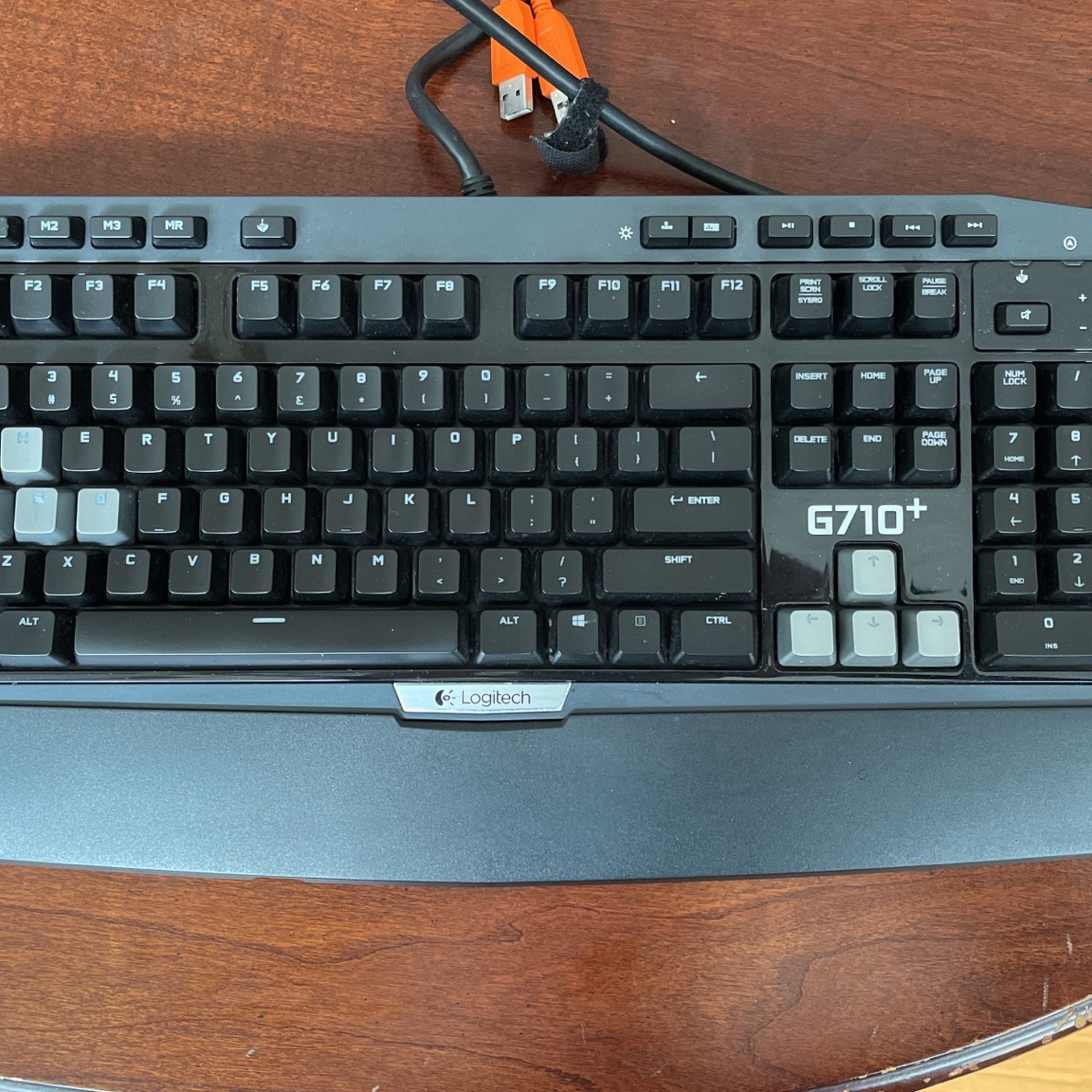 Logitech G710+ in good condition except the wrist rest hinges has broken and I hot glued it back on. It is a pretty nice gaming keyboard with adjustable bright white backlit. Volume roller, media controls, usb pass through, and custom macros. Price is a steal. Cash and local pick up only.