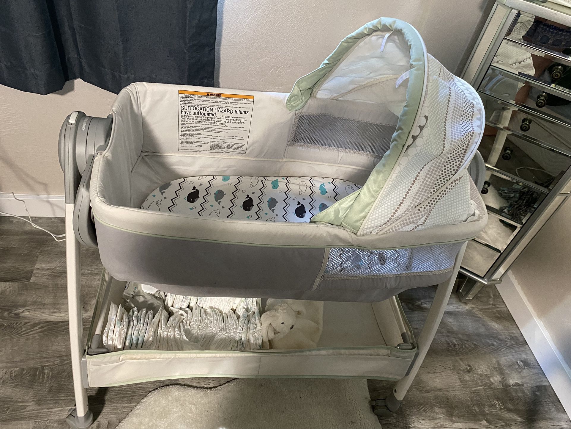 All-in-one bassinet and changing table! Good condition. Storage space on bottom. 2 vibration settings.